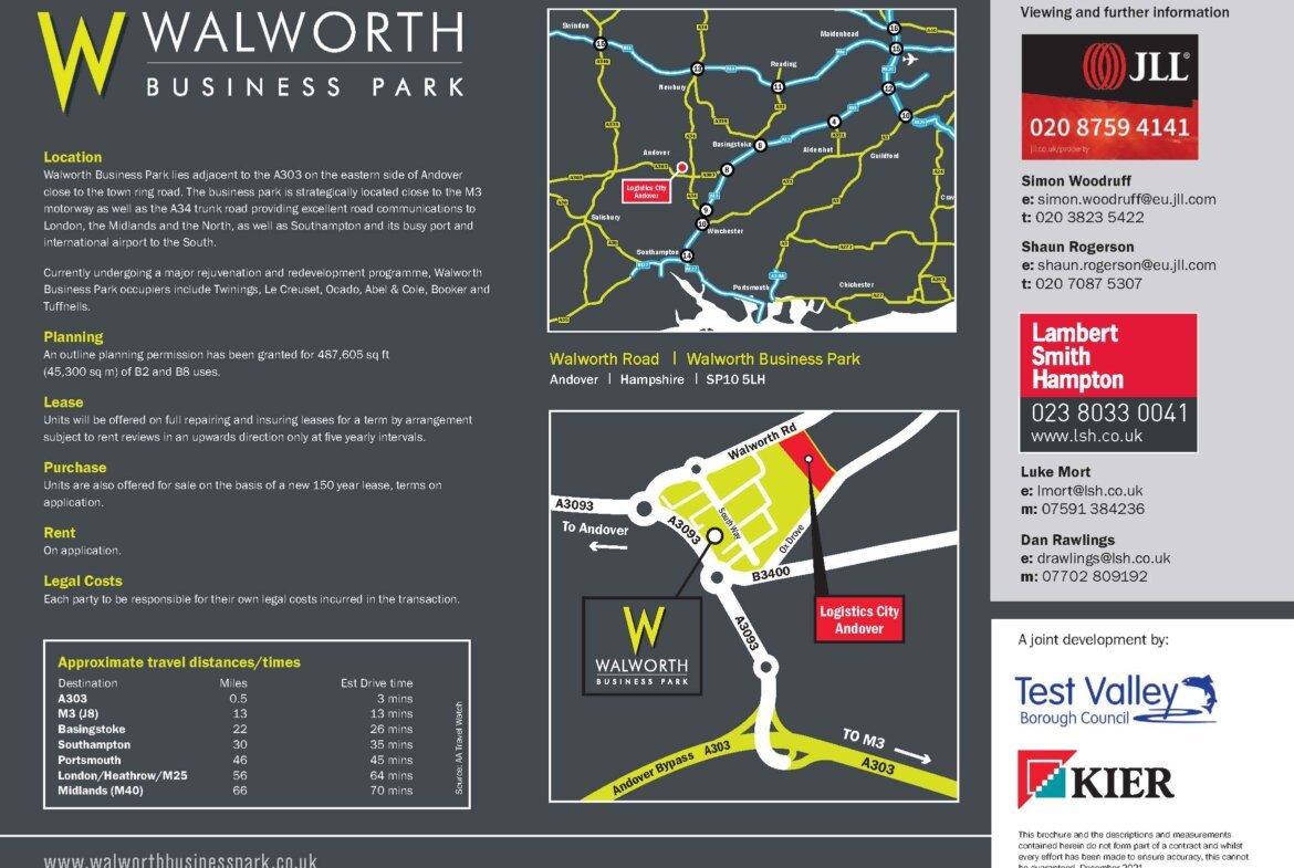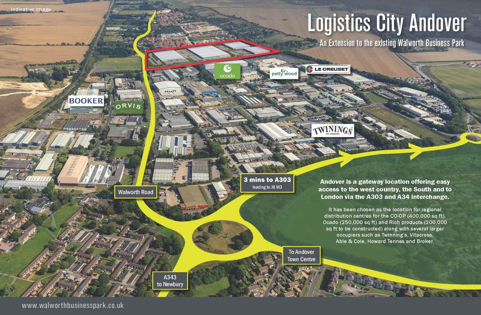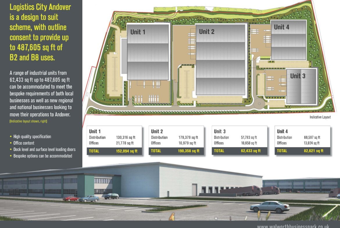 Logistics City Andover is a design to suit scheme on Walworth Industrial Park, with outline consent to provide up to 487,605 sq ft of B2 and B8 uses. A range of industrial units from 62,433 sq ft up to 487,605 sq ft can be accommodated to meet the bespoke requirements of both local businesses as well as new regional and national businesses looking to move their operations to Andover.