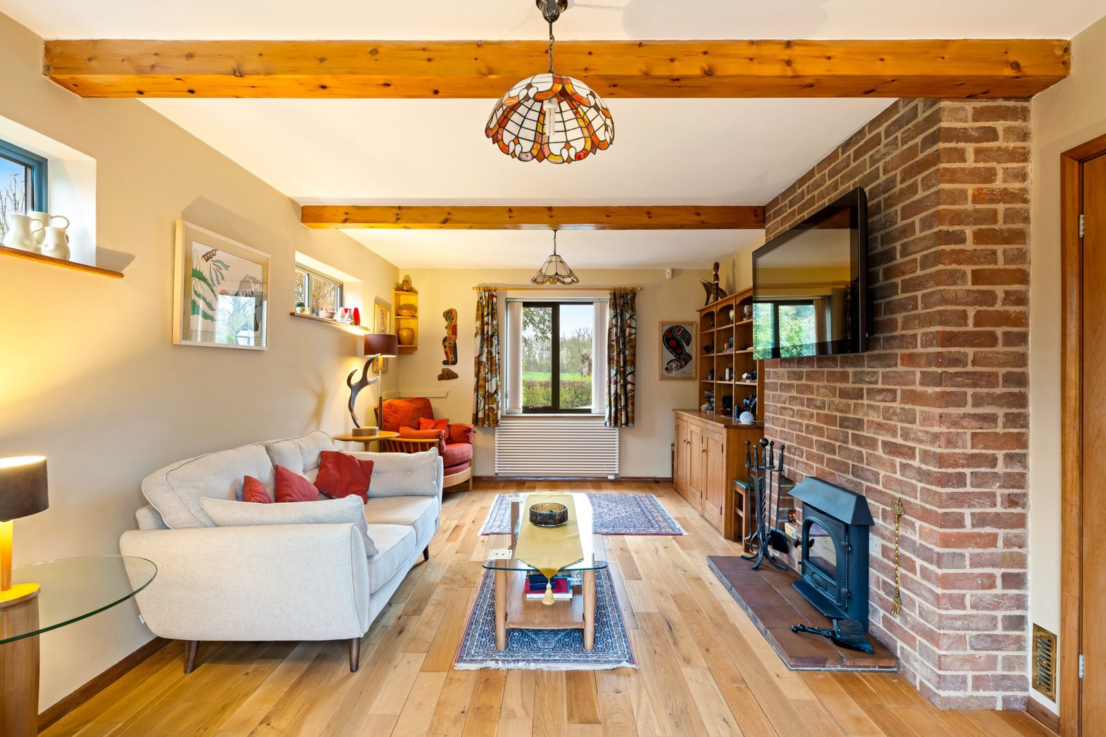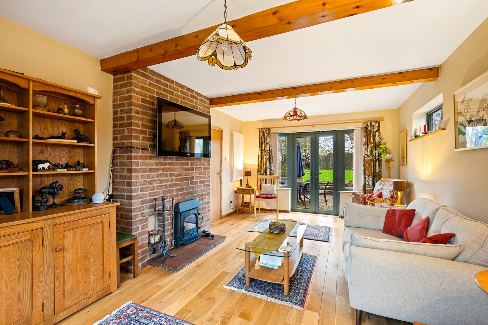Double glazed windows to both front and side, double glazed French doors opening to rear garden, multi-fuel fireplace with tiled hearth and brick chimney breast, oak flooring, two radiators.