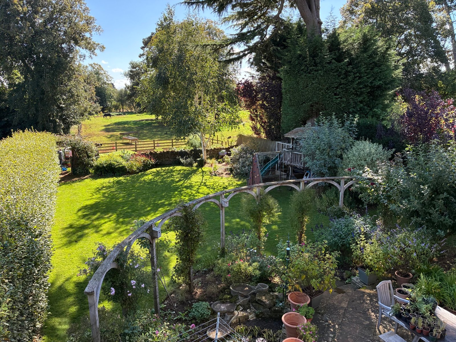 by mature hedges, oak fencing, trees and shrubs. The garden also has a constructed extension