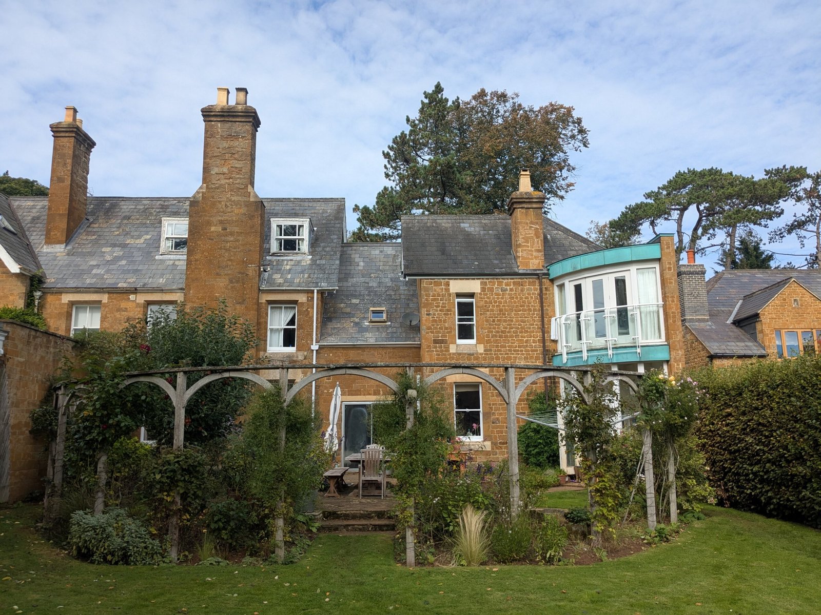 pergola and seating extending from the house and large grass area overlooking parkland, bordered