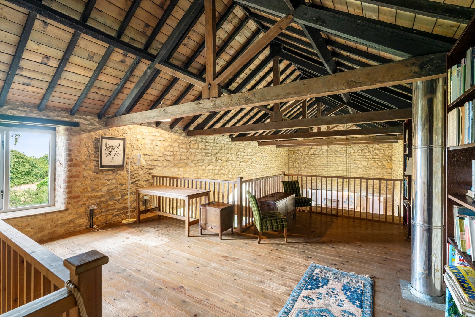 Vaulted ceiling, wooden double glazed casement window to rear elevation, exposed stone, beam and truss work.