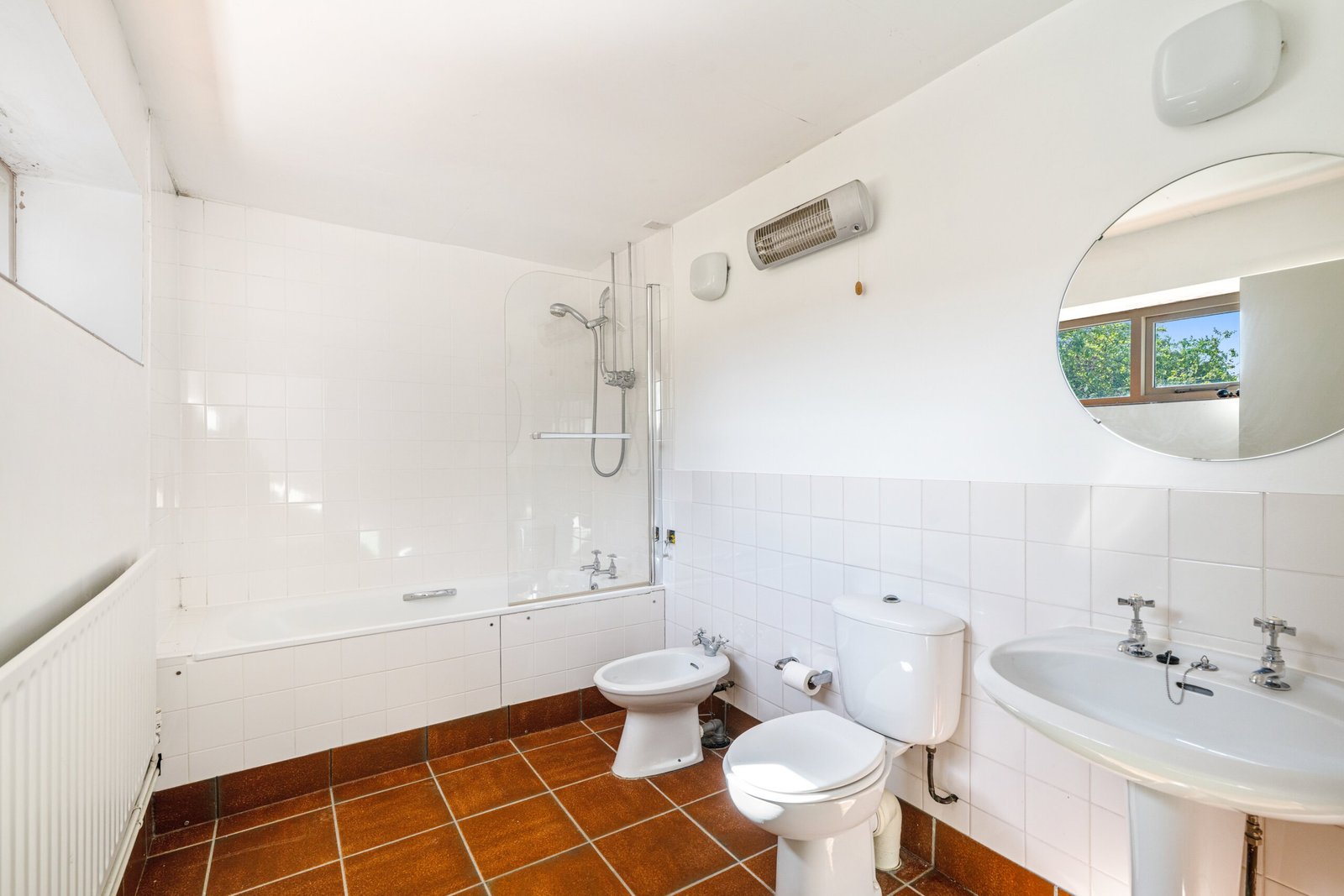 Large walk-in shower, low level WC, pedestal wash hand basin, tiled flooring, radiator.