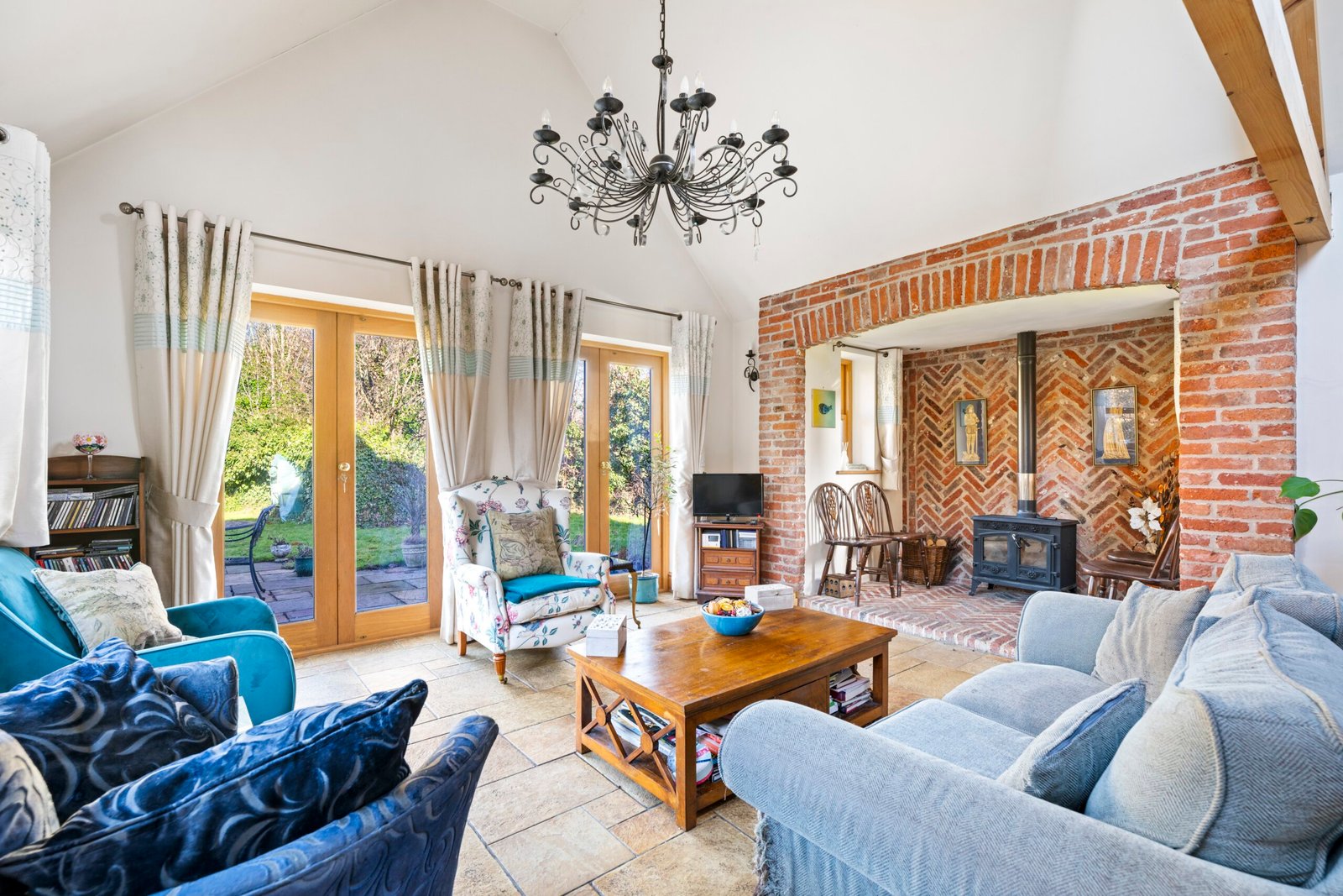 Double glazed windows to both sides, two sets of double doors opening to rear garden, large inglenook fireplace with exposed brickwork and housing a wood burning stove, vaulted ceiling with exposed beam work, Velux windows, tiled flooring with underfloor heating, ceramic drainer sink, worktops, base and eye level units, tiled splash backs, space for range cooker, central island unit with further storage, spaces for fridge freezer and washing machine.