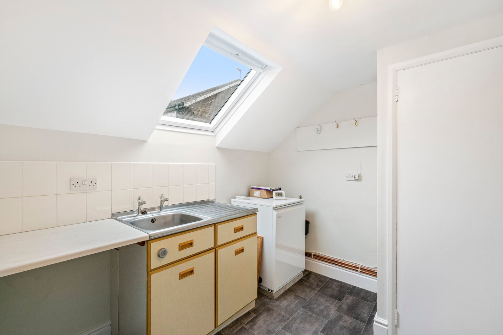 Double glazed Velux window to rear elevation, fitted base unit with space and plumbing for washing machine, Grant oil fired boiler, door to;