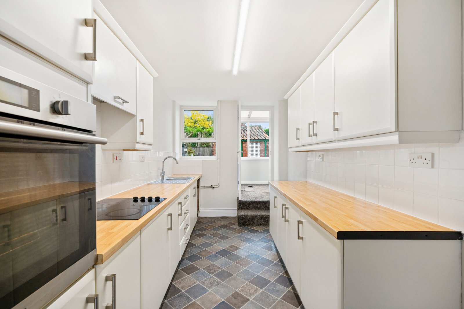 Double glazed casement windows to front and rear elevation, fitted wall and base units with stainless steel single drainer sink, four ring electric hob with extractor over, built-in oven, space and plumbing for dishwasher, part tiled walls, double radiator door to;