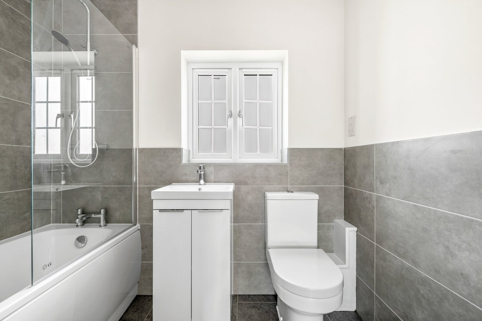 > Bathroom wall half tiled with ceramic floor and wall