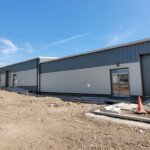 The property comprises a detached modern industrial/ warehouse of steel portal frame construction with a pitched insulated steel profile clad roof, part brick/block and steel profile clad walls and a concrete floor.
