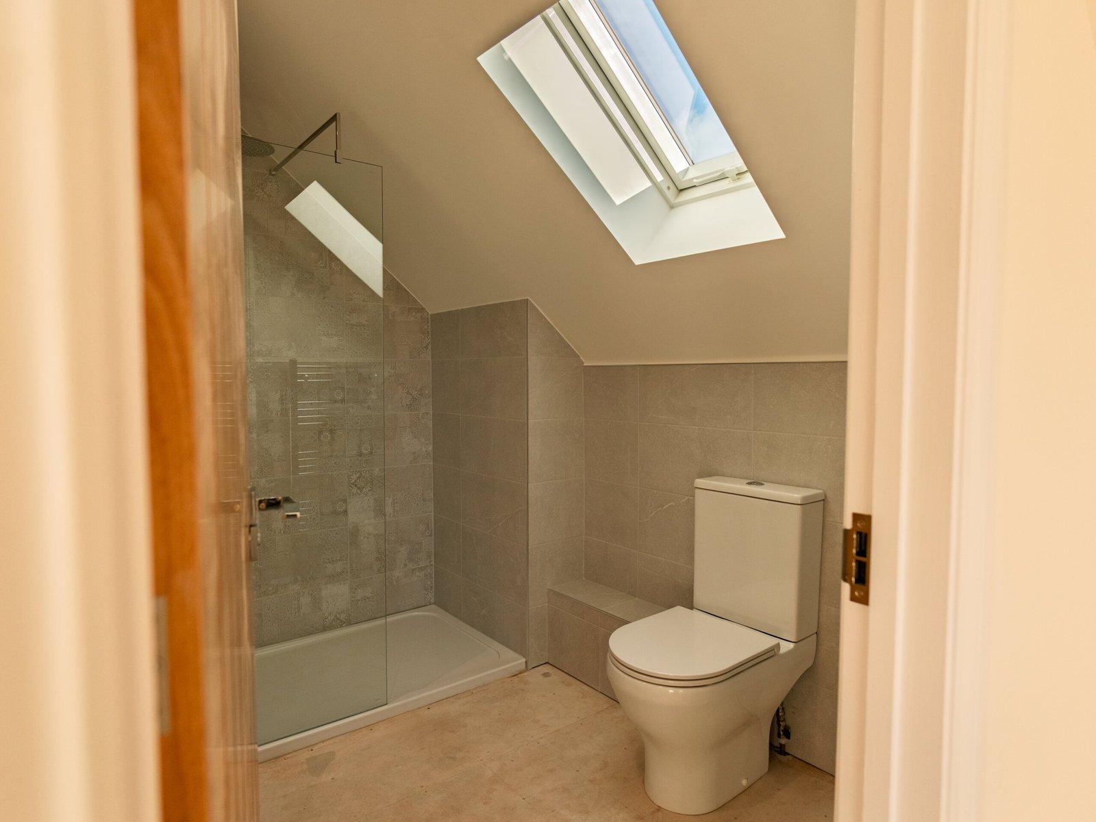 With skylight to front aspect. Contemporary suite comprising low-level WC with eco flush, walk-in shower with glass screen, drencher head, wall-mounted handheld shower head, vanity unit with inset basin and chrome mixer tap. Heated towel rail and part-tiled walls.