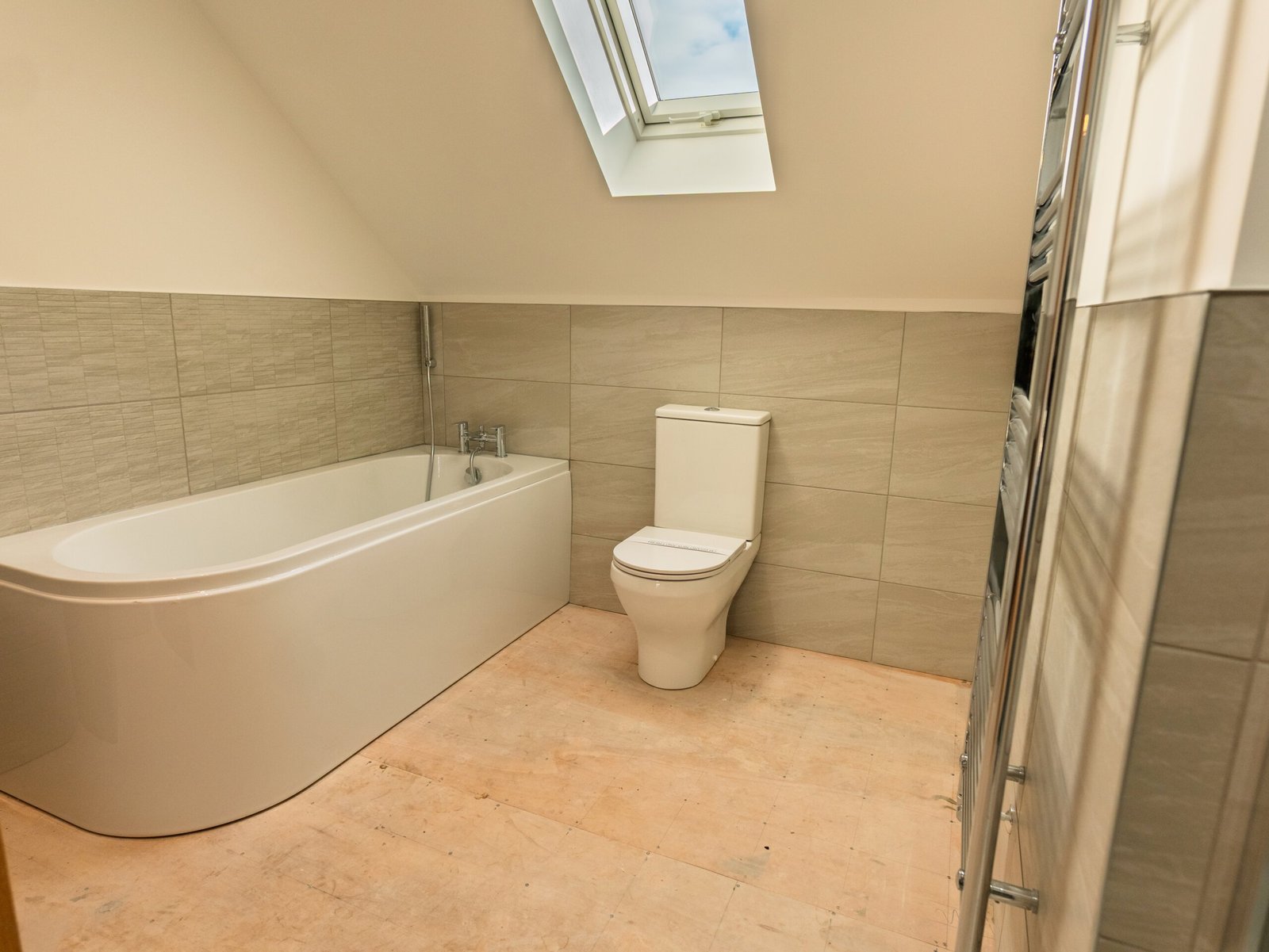 With skylight to front aspect. Contemporary suite comprising low-level WC with eco flush, vanity unit with inset basin with chrome mixer tap over, glass and chrome cubicle with drencher head and wall-mounted handheld shower head, panelled bath with chrome mixer tap and wall-mounted handheld shower head. Heated towel rail and part-tiled walls.