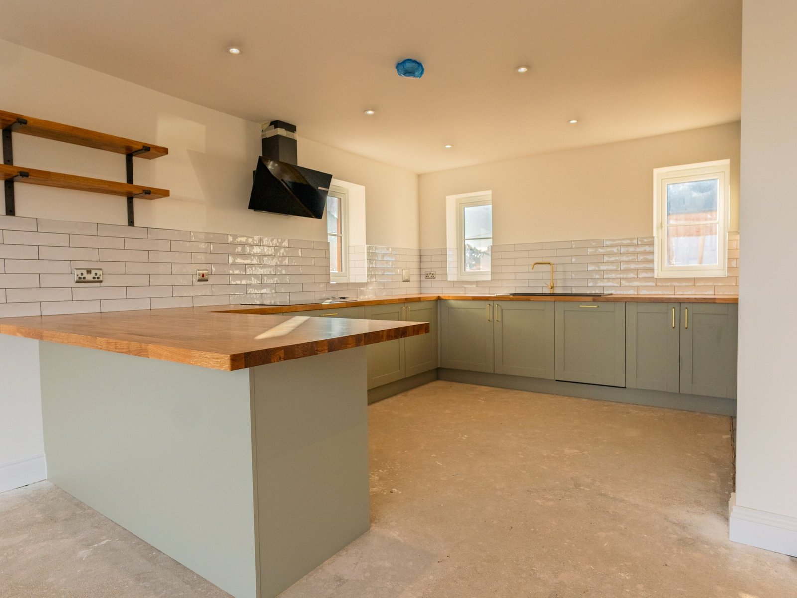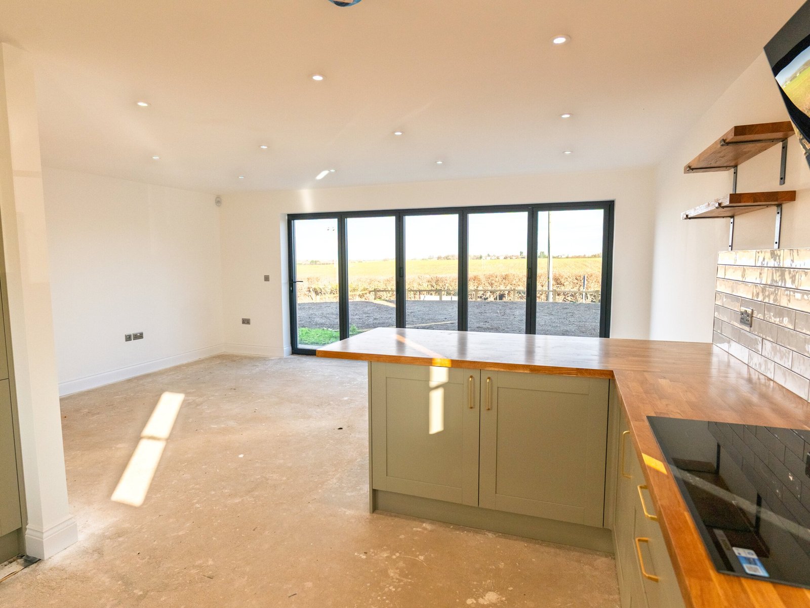 With windows to front and side aspects. Bespoke fitted kitchen with a range of matching eye and base-level units. Oak countertop with inset black sink and a half with gold mixer tap over, inset induction hob with extractor hood over and tiled backsplash. Integrated appliances including chest-level microwave oven with additional electric oven below, dishwasher, and fridge freezer. Peninsula with breakfast bar. Bi-fold doors to rear aspect. Door to