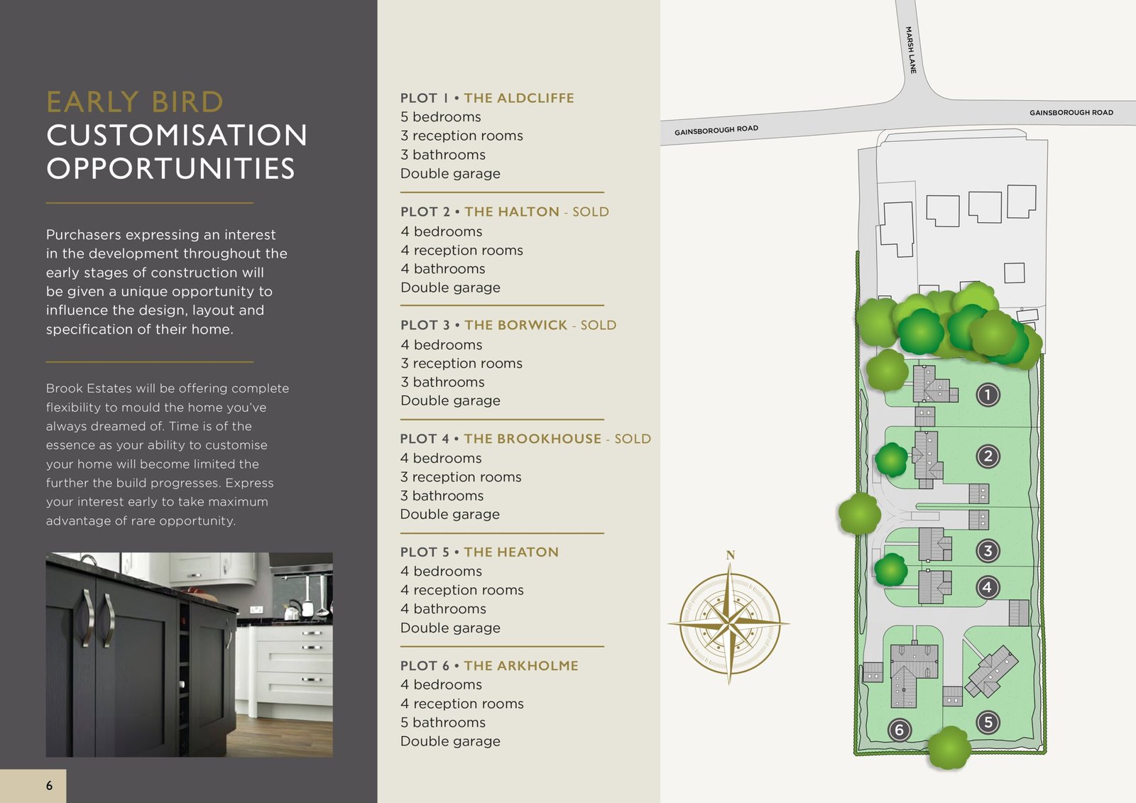Early Bird Reservation Opportunities – Purchasers expressing an early interest in the development, throughout the initial stages of construction, will be given a unique opportunity to influence the design, layout and specification of their home. Brook Estates will be offering complete flexibility to mould the home you’ve always dreamed of. Time is of the essence as your ability to customise your home will become limited the further the build progresses. Express your interest early to take maximum advantage of this rare opportunity. Don’t waste too much time as only 3 of the 6 plots are left available for sale!