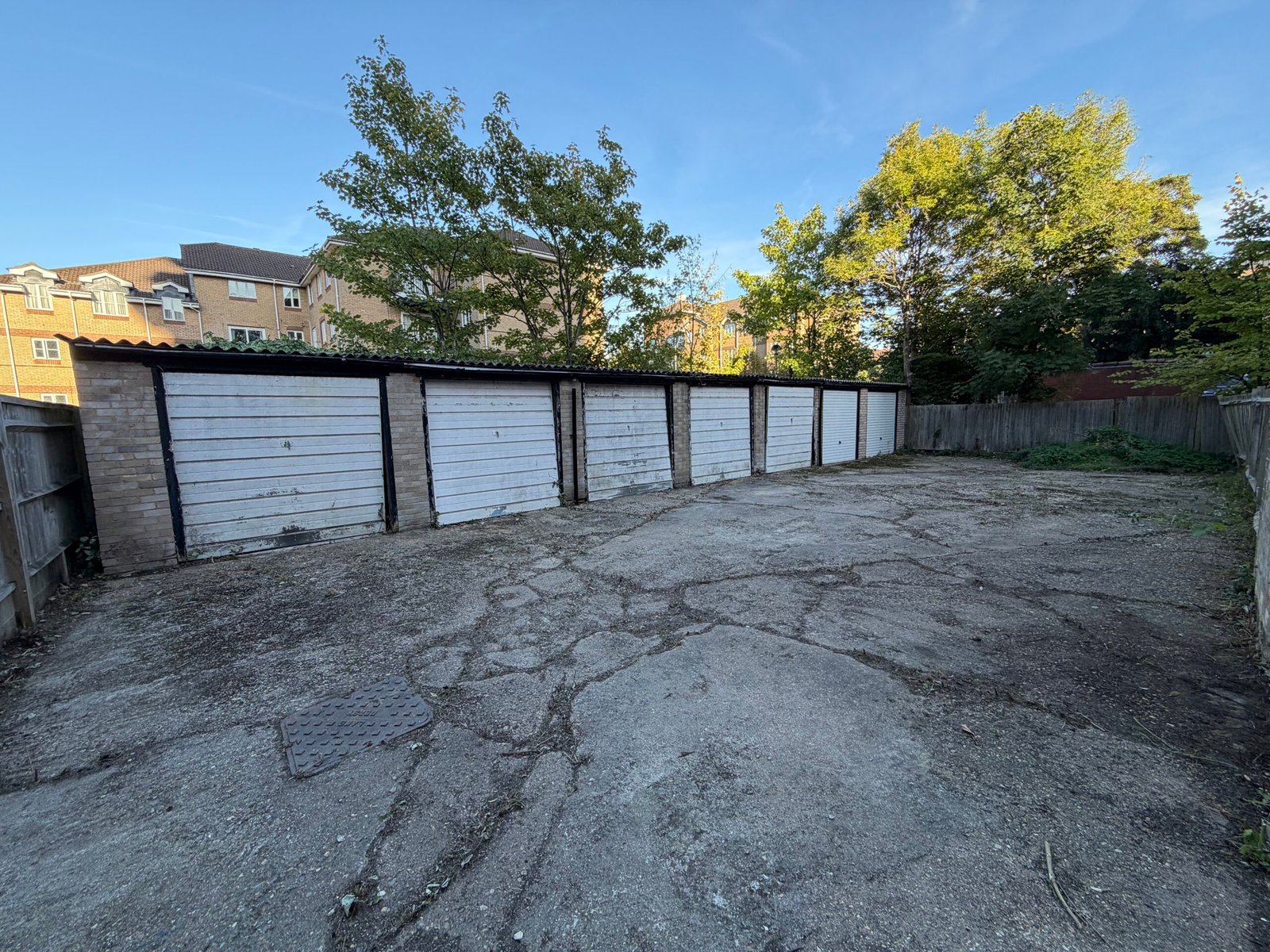 The garages sit behind a residential apartment building and are approached by a single carriage drive.