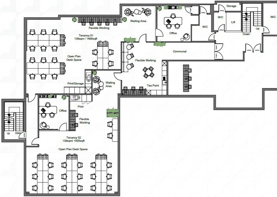 The part first floor wing is to be refurbished to include air conditioning, new suspended ceiling with LED lighting. Current plans are to split the space to provide two new suites with a shared kitchen breakout space. The suites can be offered refurbished ready for a tenant to be fit out themselves or as a Cat A+ fully fitted and furnished solution. At this stage, there is an opportunity for an occupier to influence the fit out.