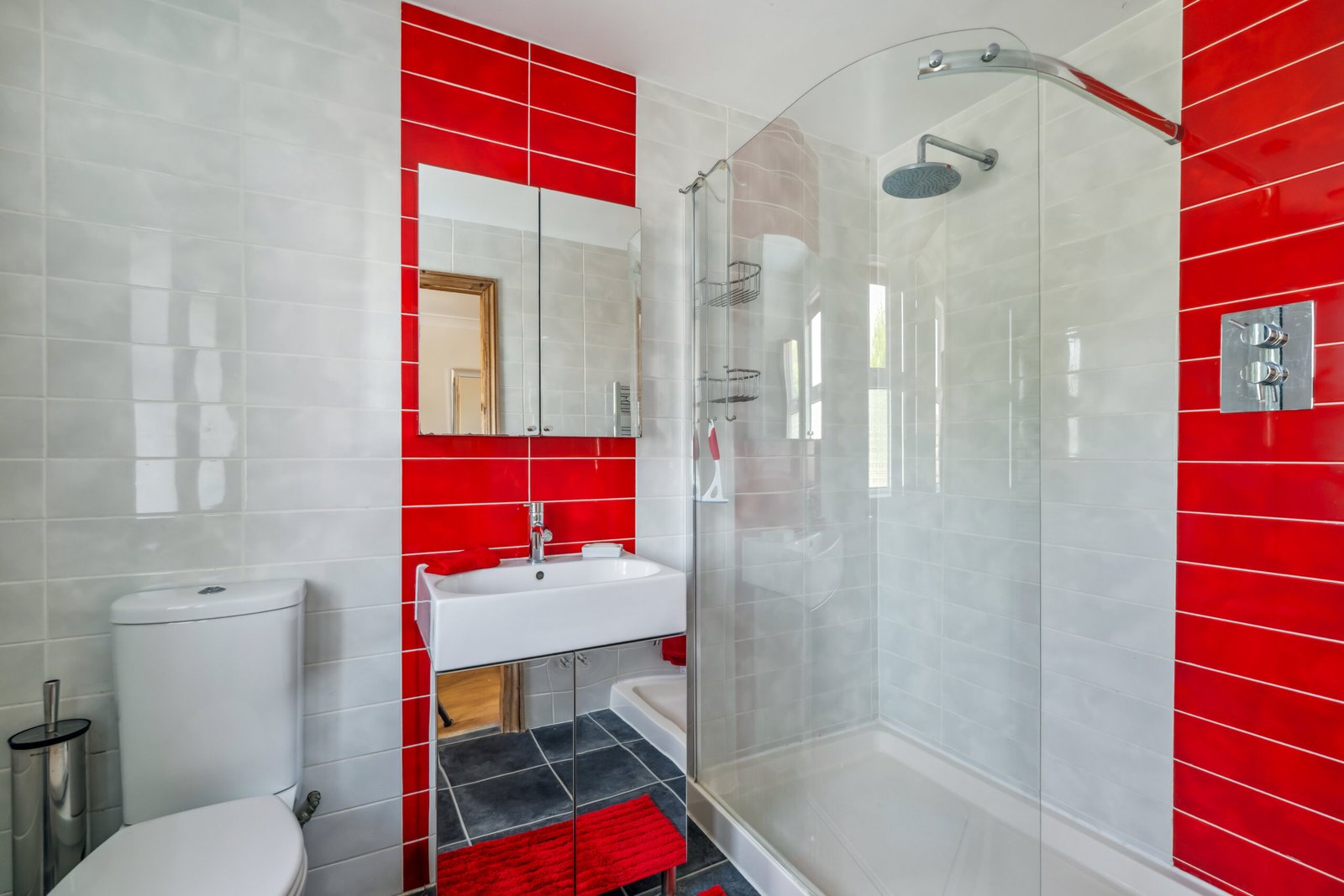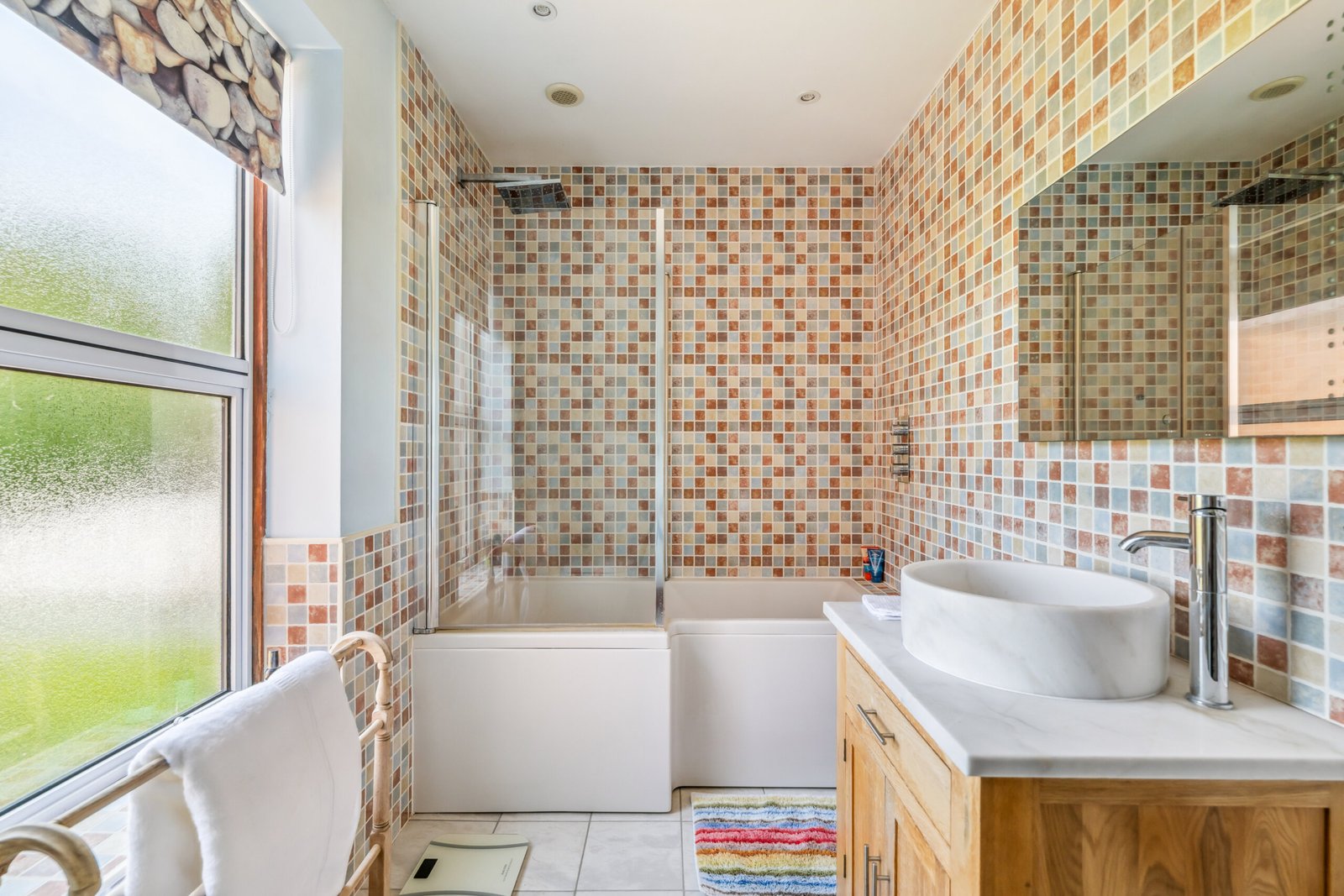 Double glazed window to rear, bath with wall mounted shower unit over and glazed shower screen, WC, wash basin, heated towel rail, tiled flooring.