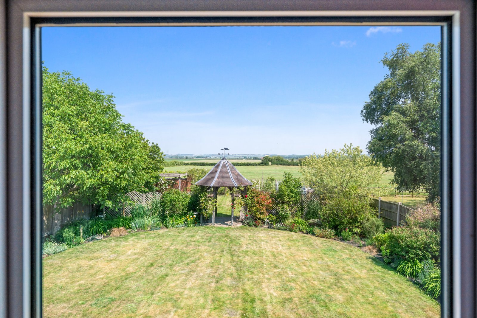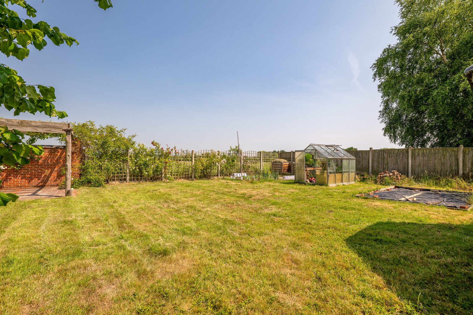 To the front is a lawned garden and gated access leading to a driveway, double garage and carport. To the rear is a large lawned garden which enjoys open-field views, patio and decked seating areas, pergola, greenhouse, vegetable patches, decorative shrubs and borders.