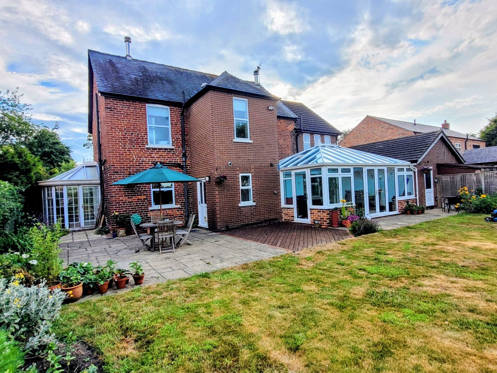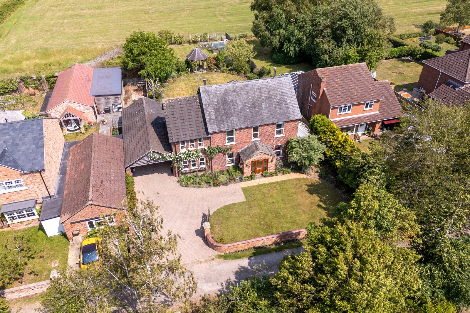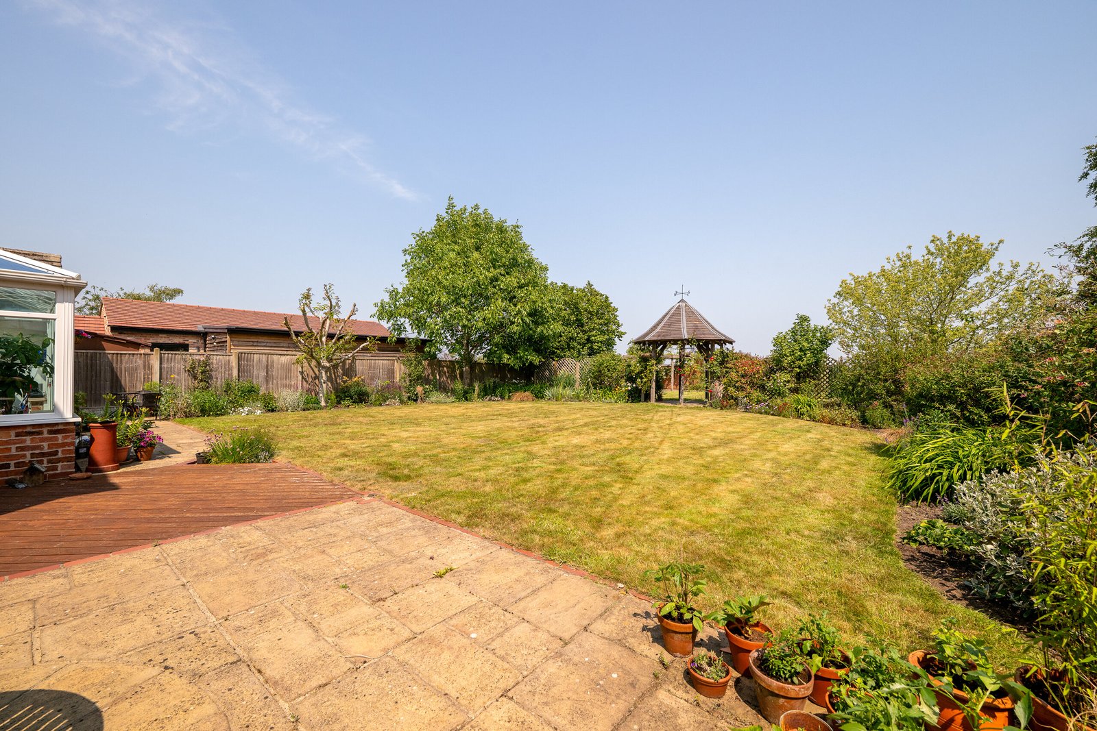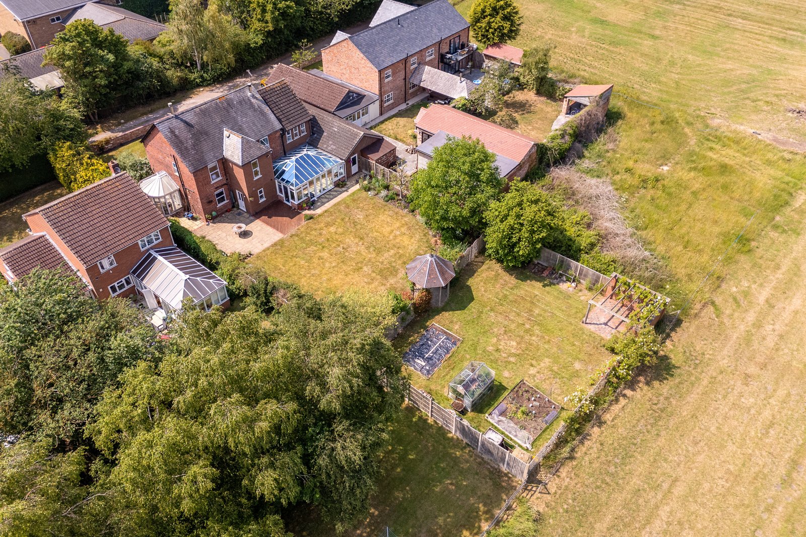 Outside to the front gated access leads to a driveway providing ample parking and leads to a car port and double garage. To the rear is a large lawned garden with patio and decked seating area, a range of decorative shrubs and borders, vegetable patches, pergola, greenhouse and open-field views.