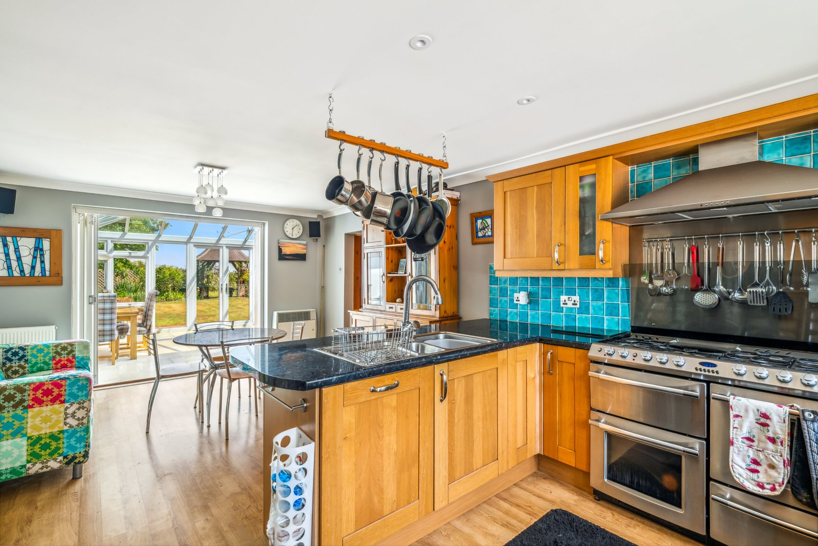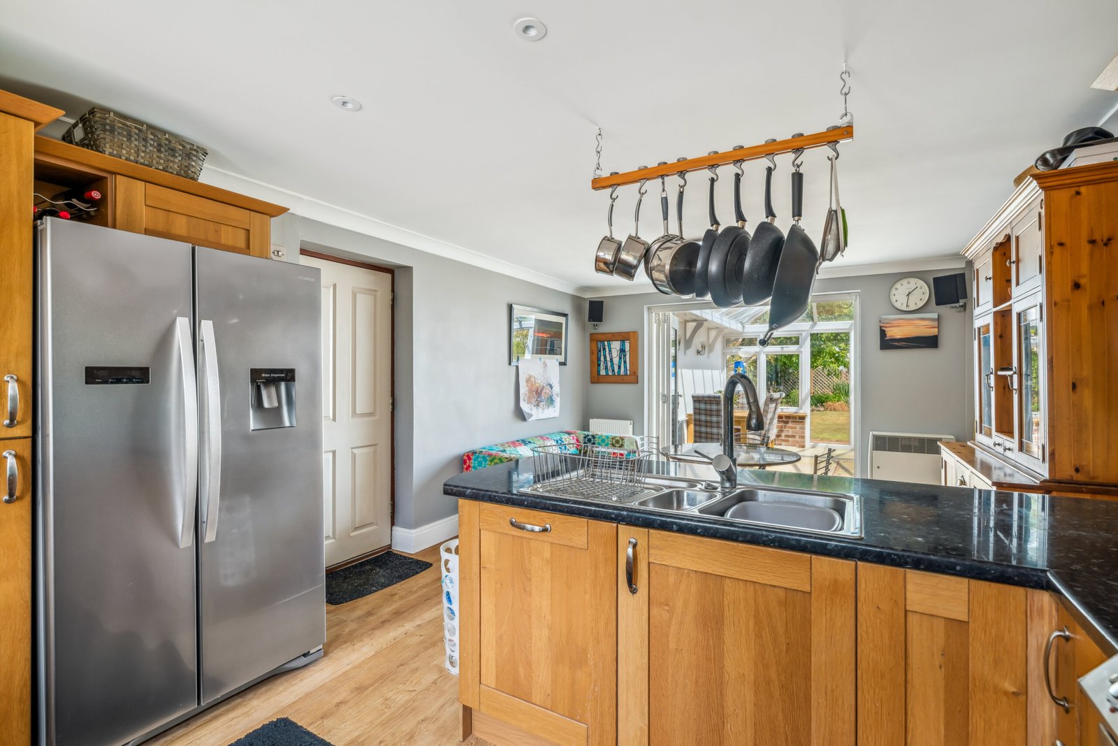 Double glazed windows to front, side entrance door, bi fold doors opening into conservatory, one and a half stainless steel drainer sink, a range of matching base and eye level storage units, preparation work tops, spaces for Range cooker and American style fridge freezer, integrated dishwasher, tiled splash backs, two radiators.