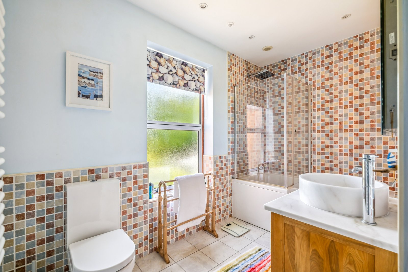 Double glazed window to side, shower cubicle, pedestal wash basin, WC, tiled walls and flooring, radiator.