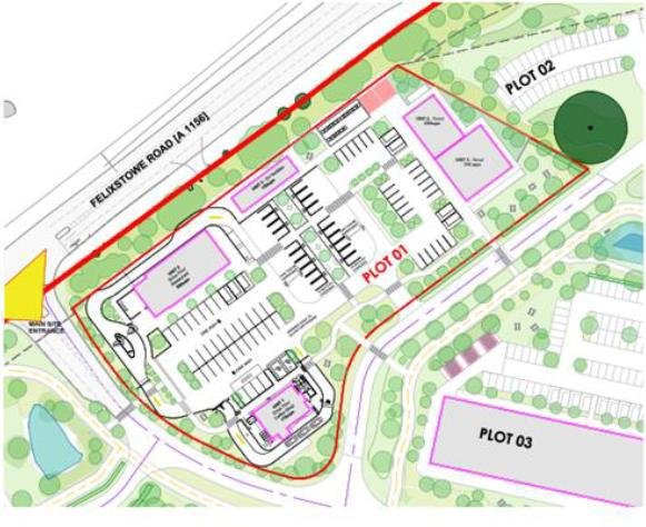 Vehicular access will be via a new central spine road off Felixstowe Road, providing access to the A14/A12 roundabout.