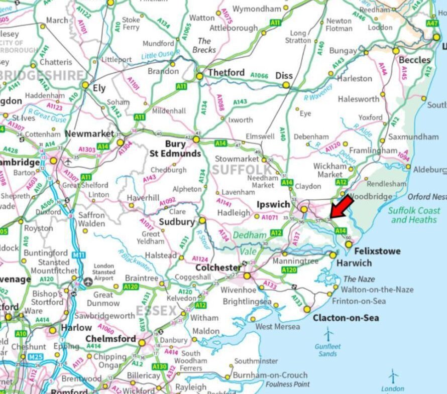 Daily traffic flows recorded on the A14 amount to 51,500 vehicles per day (2022) and on the A12 44,000 vehicles per day. The development will be accessible to both east and west bound traffic on the A14 together with the A12 which heads north/east to the Suffolk coast.