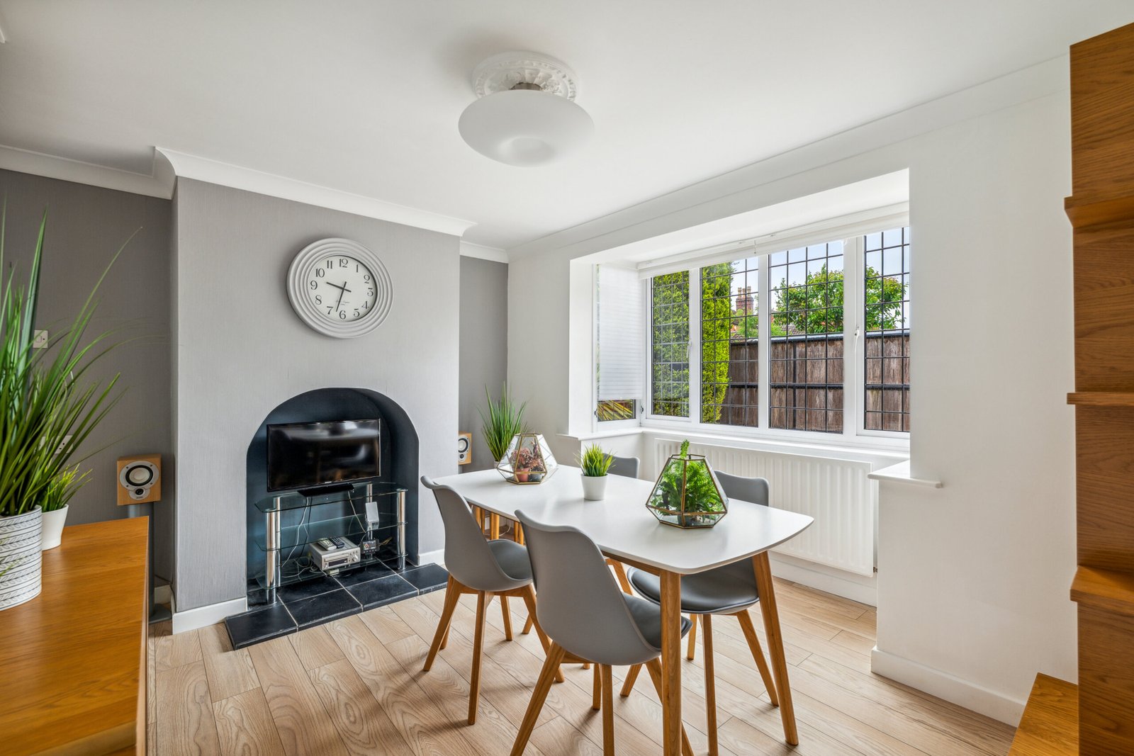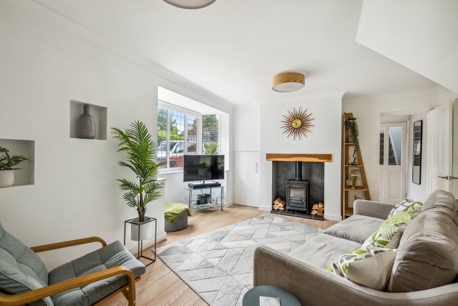 Double glazed bay window, wood burning stove, staircase rising to first floor, storage cupboard, radiator.