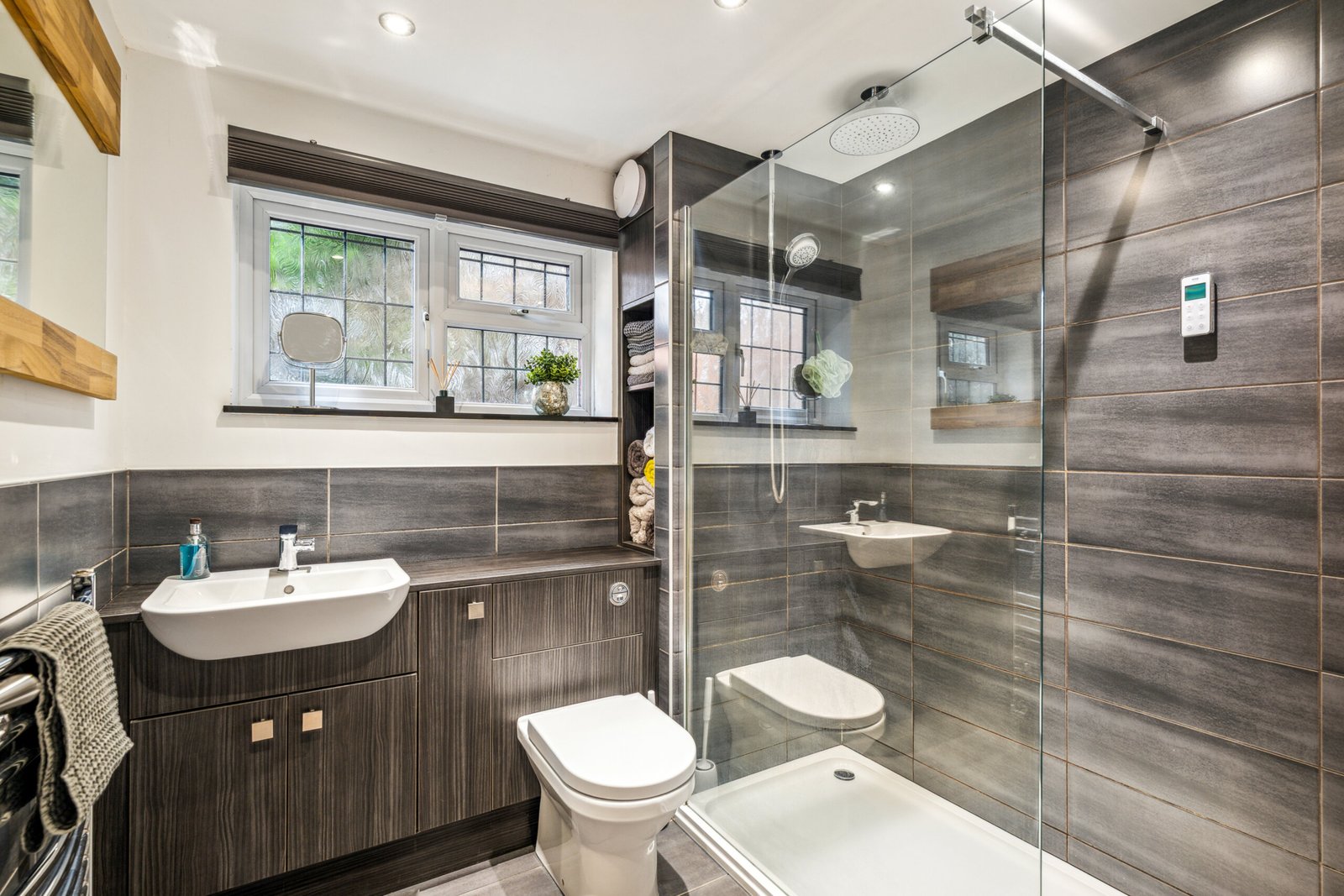 WC, shower cubicle, pedestal wash basin, heated floors, tile under floor heating, extractor.