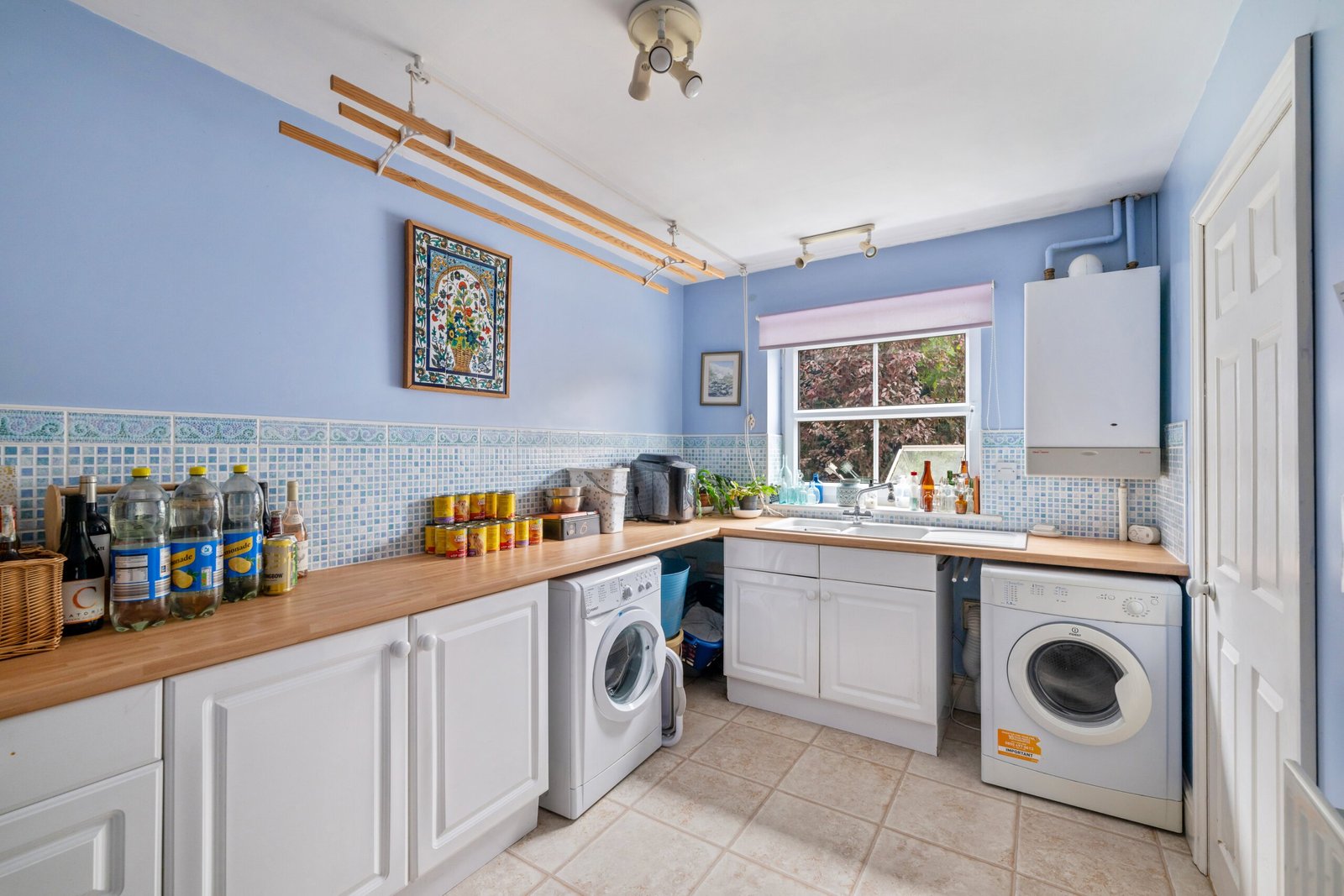 Double glazed window to rear, drainer sink, worktops, base level storage units, spaces for washing machine and tumble dryer, tiled splash backs, wall mounted boiler, tiled flooring, radiator.