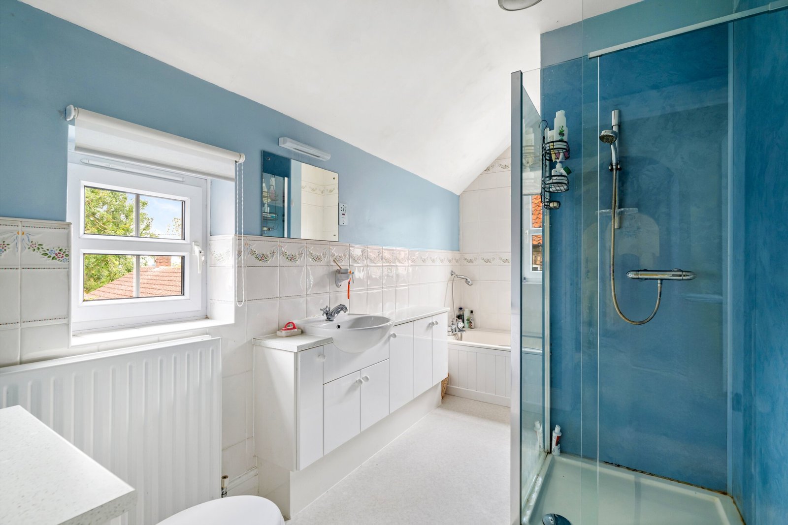 WC, pedestal wash basin, shower cubicle, radiator.
