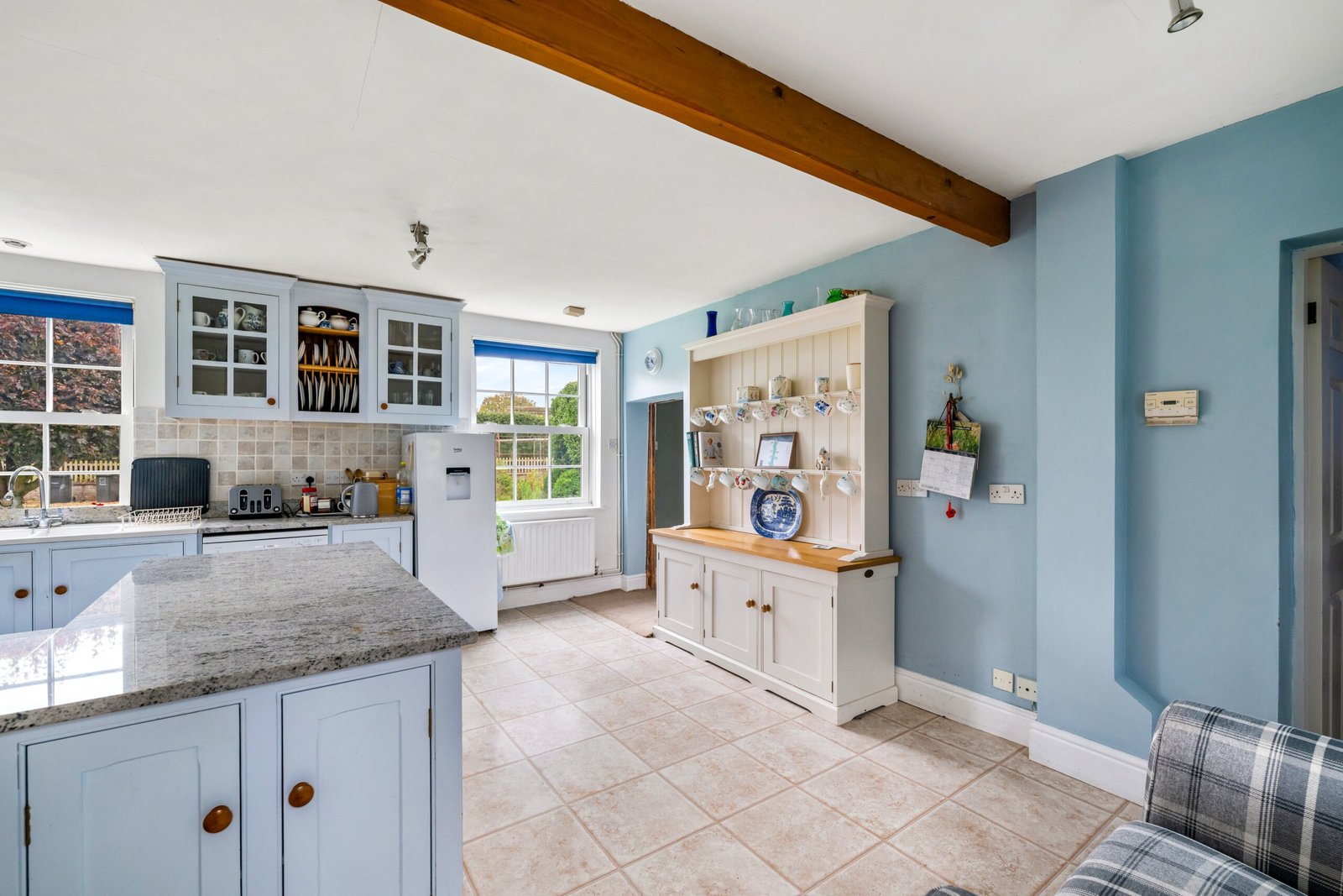 Double glazed windows to front and rear, drainer sink inset to worktop, base and eye level storage units, spaces for range cooker, fridge freezer and dishwasher, breakfast bar, tiled splash backs, pantry, tiled flooring, radiator.