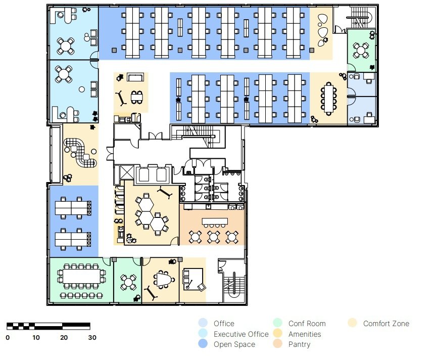 THE PLACE has undergone a refurbishment to provide high quality fitted workspace, just a short walk from the station and the Waterside Quarter. The second floor is available fully fitted with suites from 3,500 sq ft. The building's enhanced outdoor terrace embraces its natural surroundings, overlooking The Strand waterway and The Amphitheatre. A new reception space with business lounge and breakout area welcomes staff and visitors. There are 21 secure car spaces at a ratio of 1:410 sq ft, cycle racks, a shower and lockers.