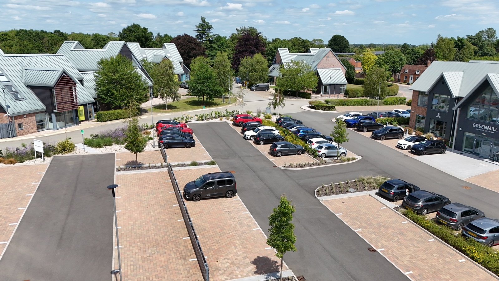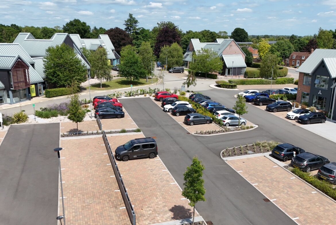 Electric charging points (22kW) are provided in marked brick pavioured bays.