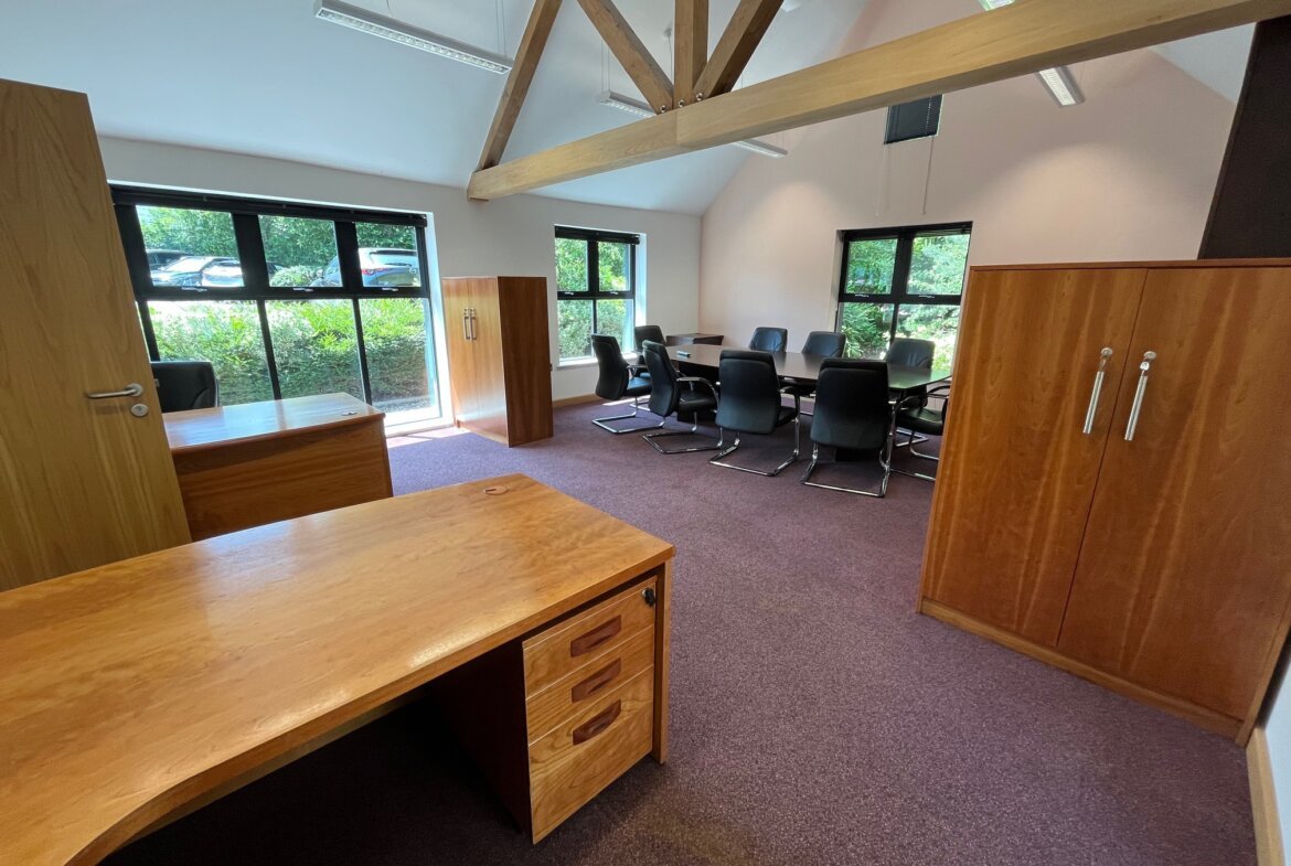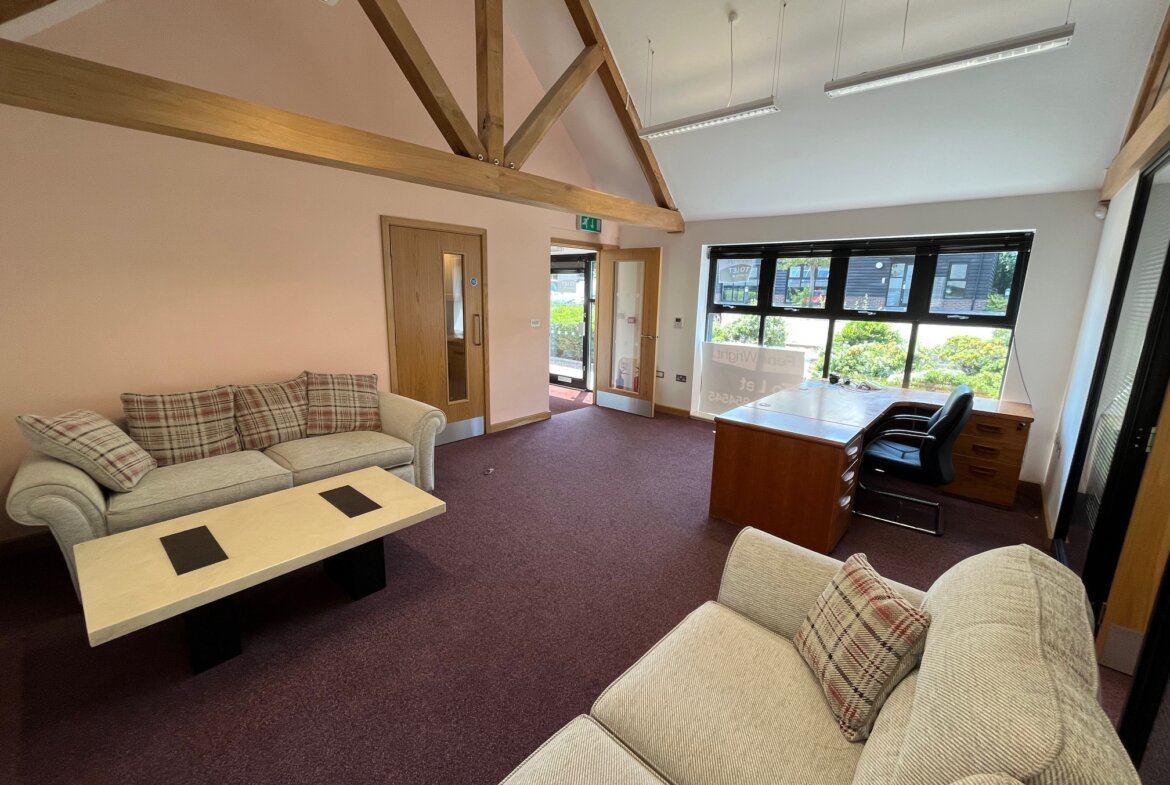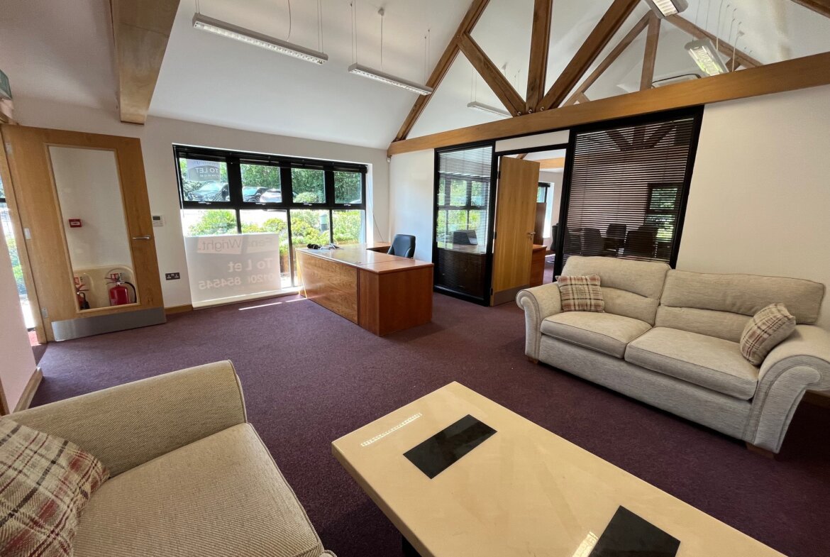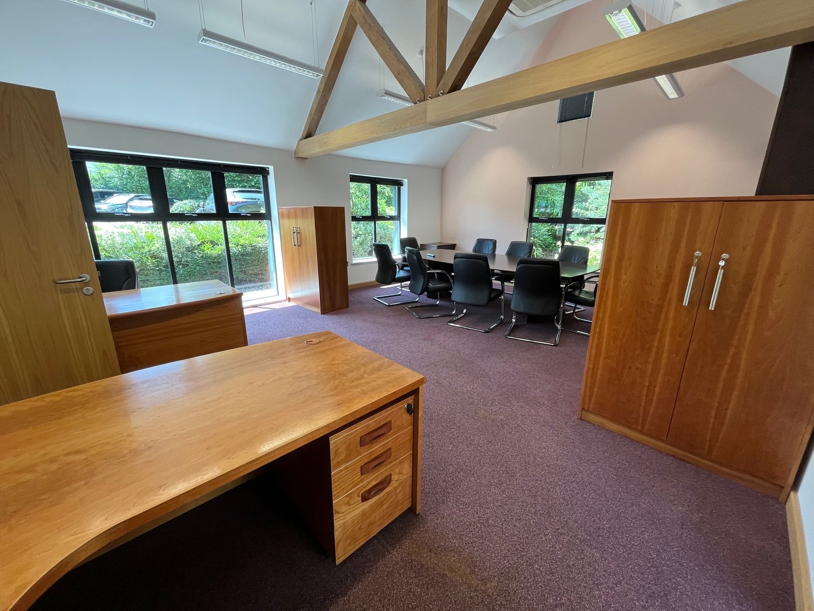 A single storey, self-contained, office which benefits from an impressive vaulted ceiling, partition wall (providing two separate working areas), air conditioning, lighting, carpeting, high speed fibre optic broadband (BT lease line of 80 mb download & upload), alarm system, network cabling & switch panel, tea point, accessible WC facility and shower.