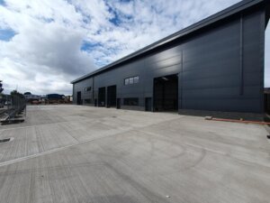 A brand new building of steel frame construction with 4 ground level electric roller shutter doors and an eaves height of approx. 9m. The unit also benefits from 230KvA incoming power, 40Kn/m2 floor loading capacity and roof lights.