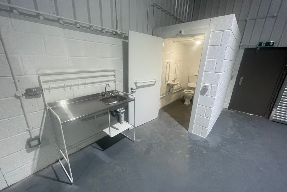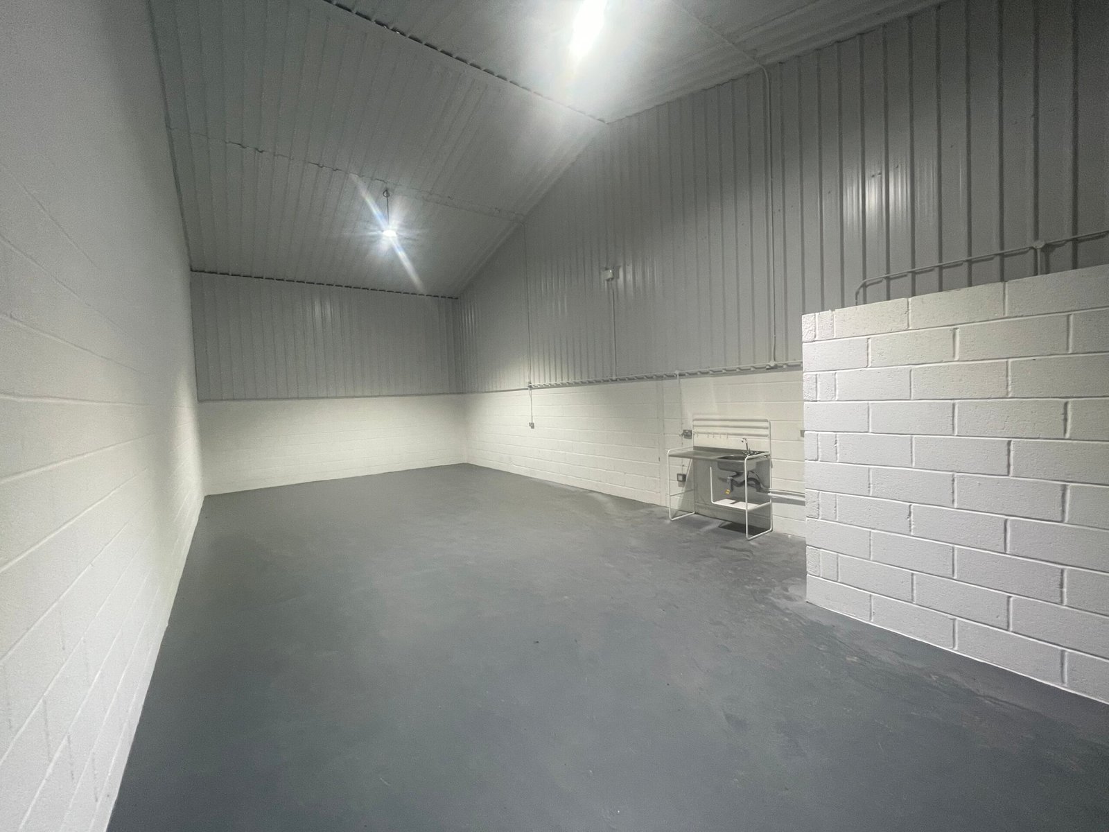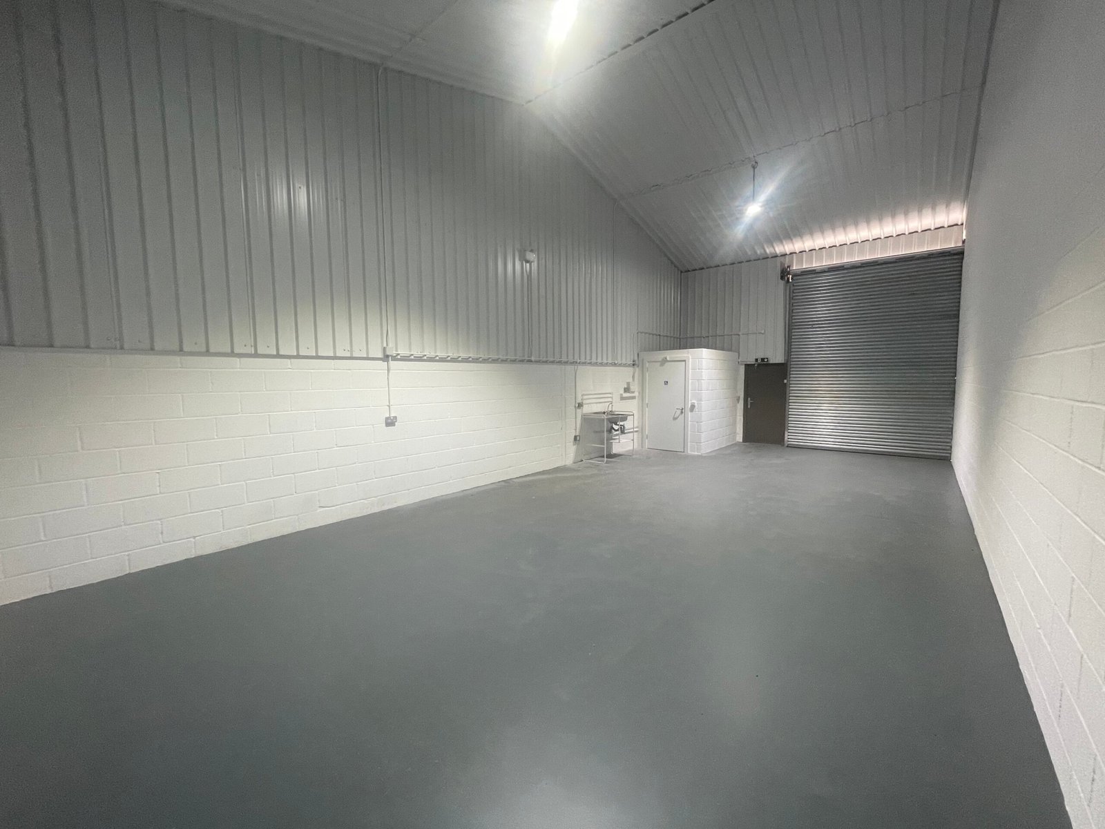 Plastic coated pedestrian security door to front, roller shutter door with a width of 3.02m and a height of 3.99m, level concrete floor, WC facility, kitchenette, LED lighting and concrete apron to front.
