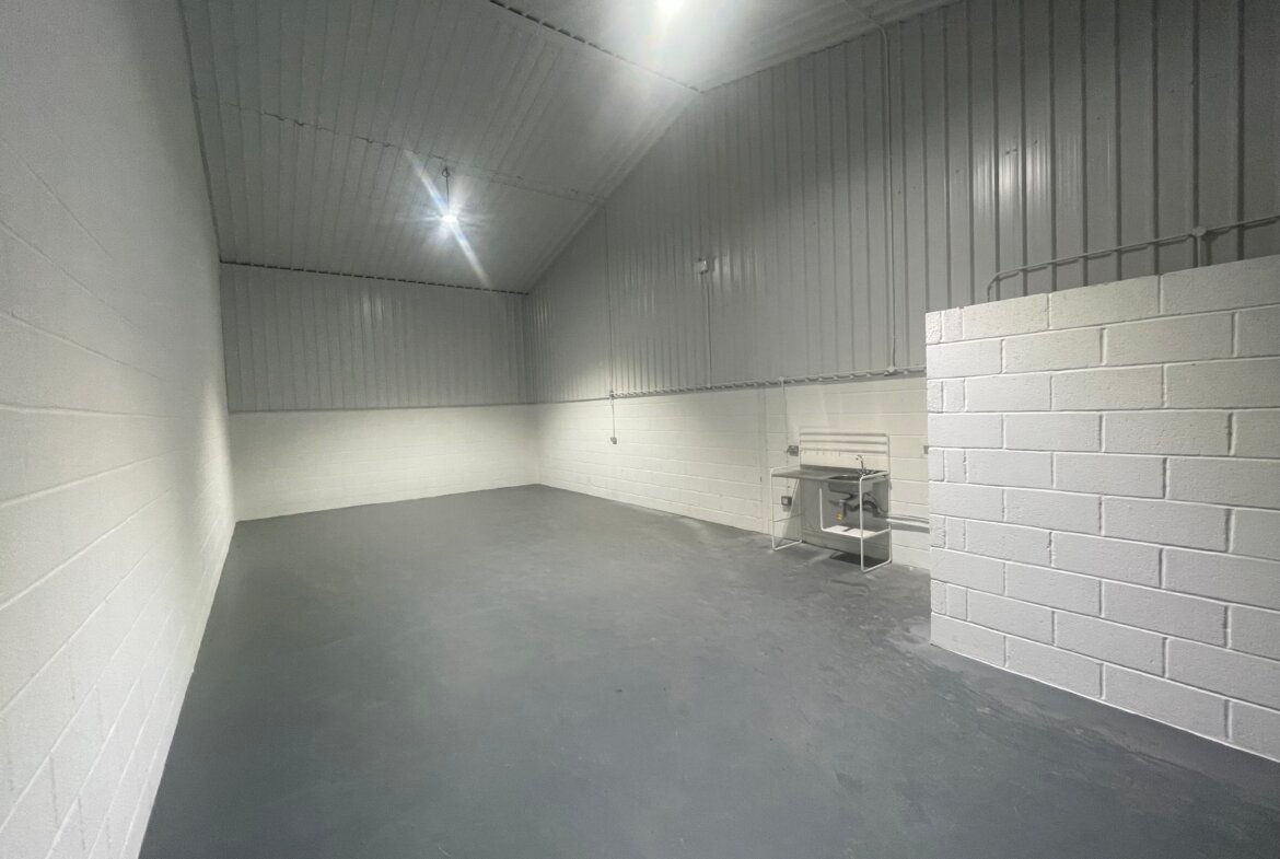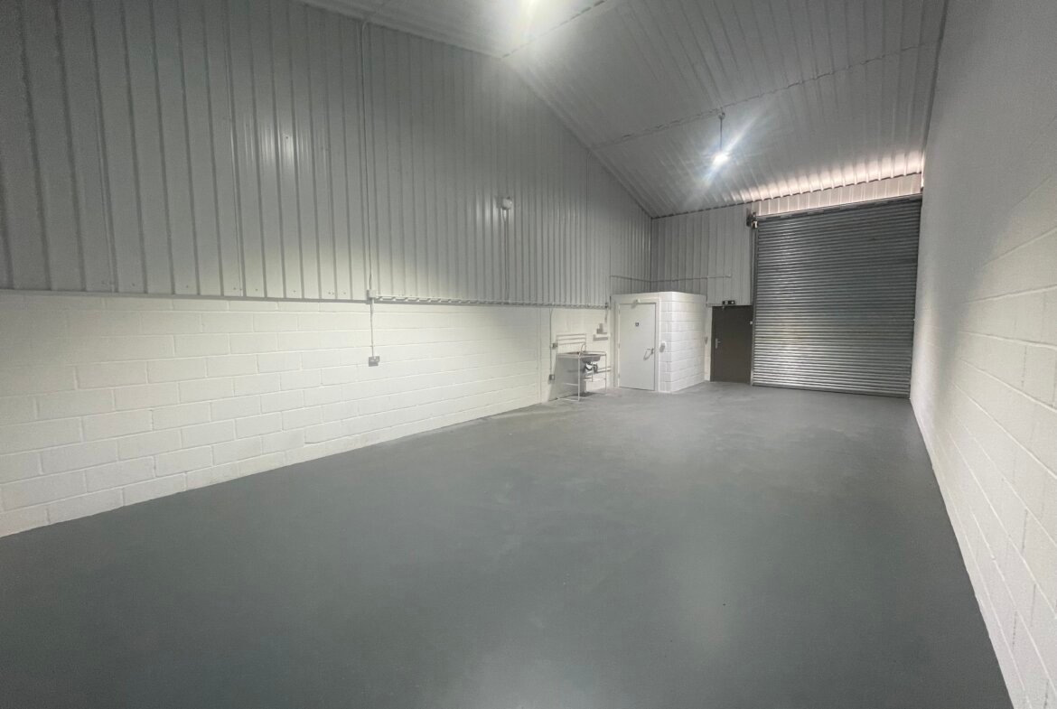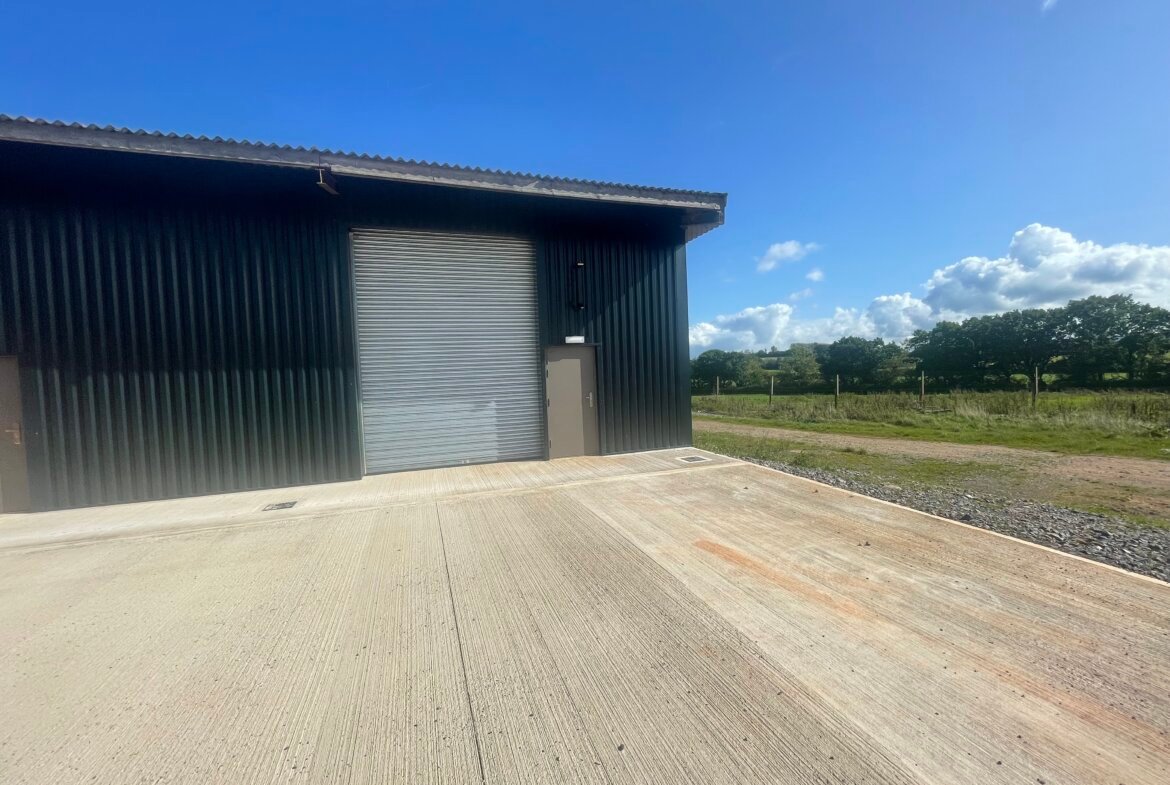 The industrial unit is a refurbished farm building with profiled metal cladding, a plastic coated pedestrian security door, a roller shutter door, a concrete floor, LED lighting, WC facility and kitchenette.