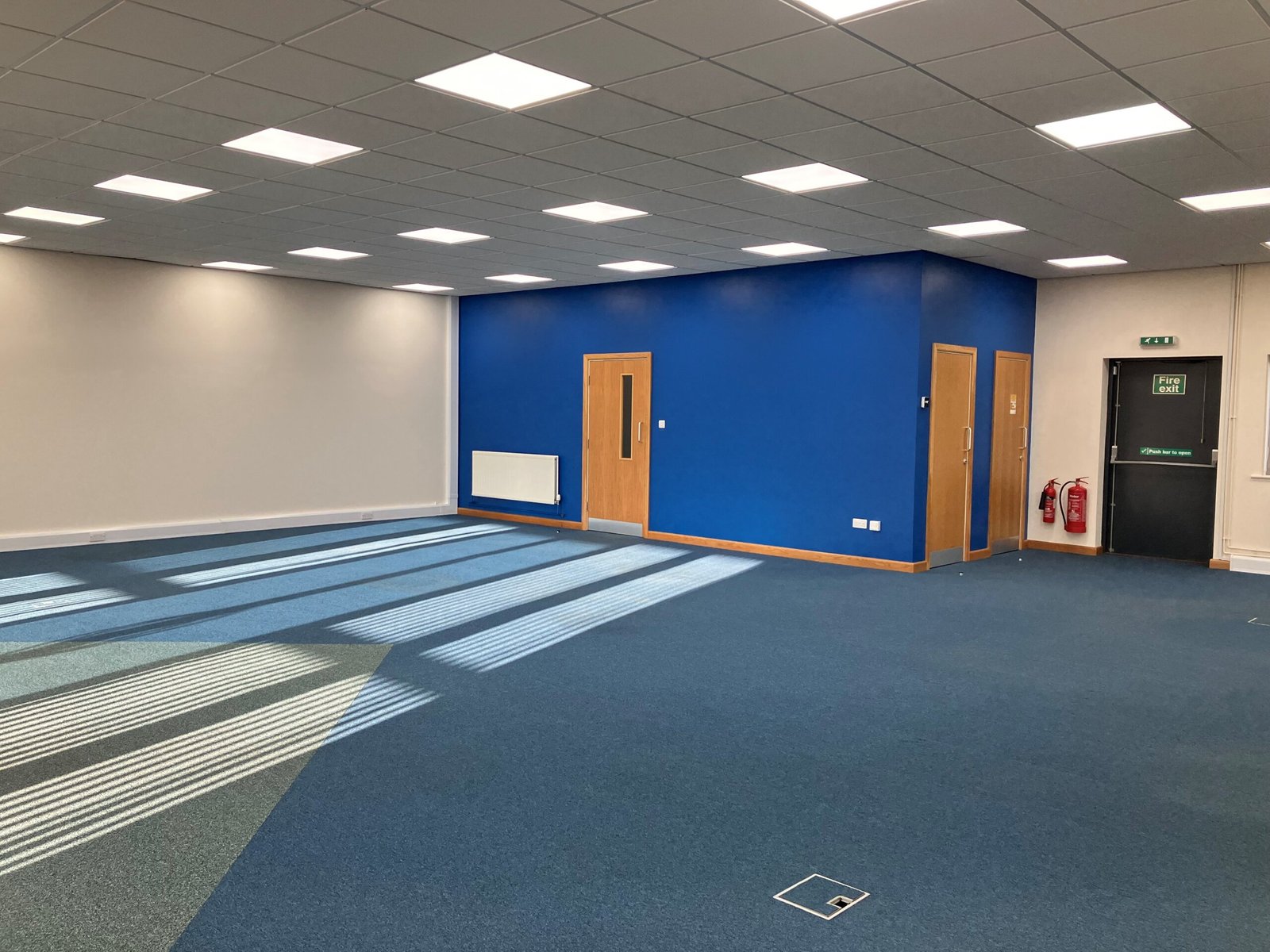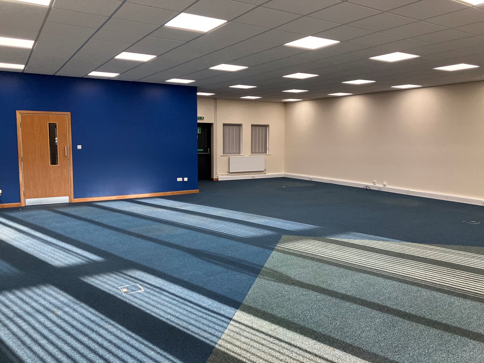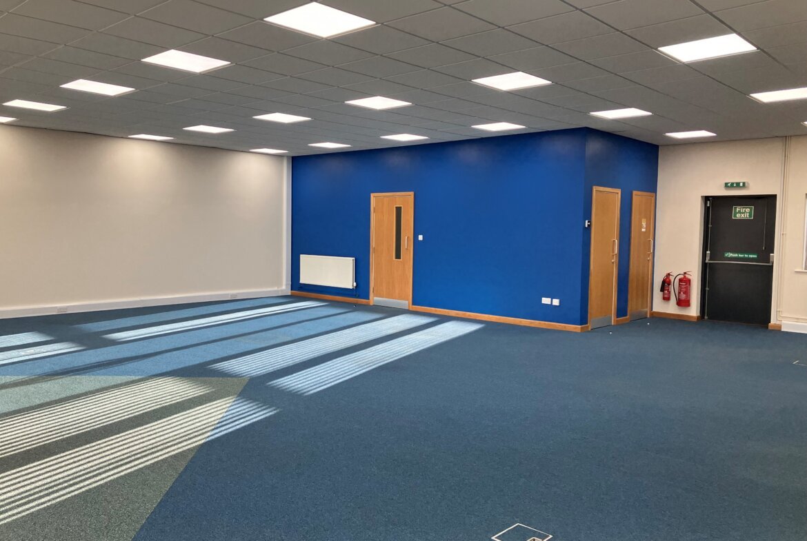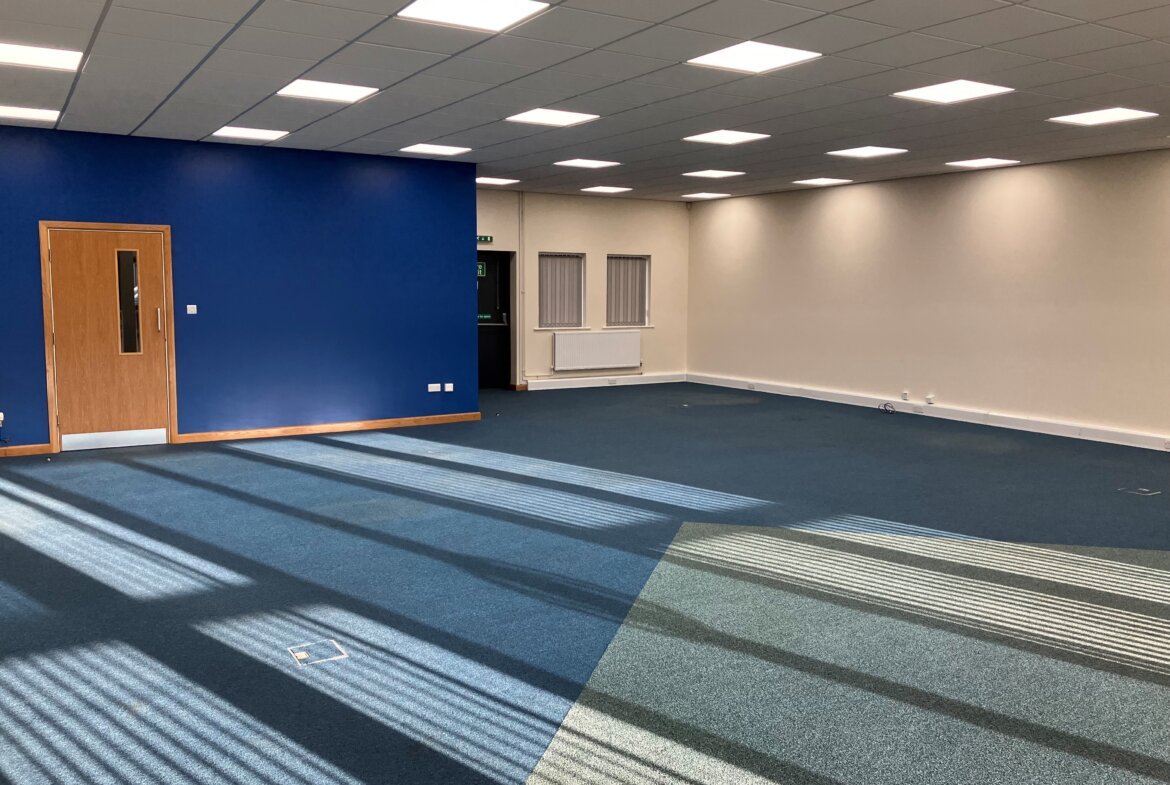 Specification includes suspended ceiling with inset LED lighting, full carpet tile coverage, perimeter trunking at skirting level and floor boxes providing ancillary power points.