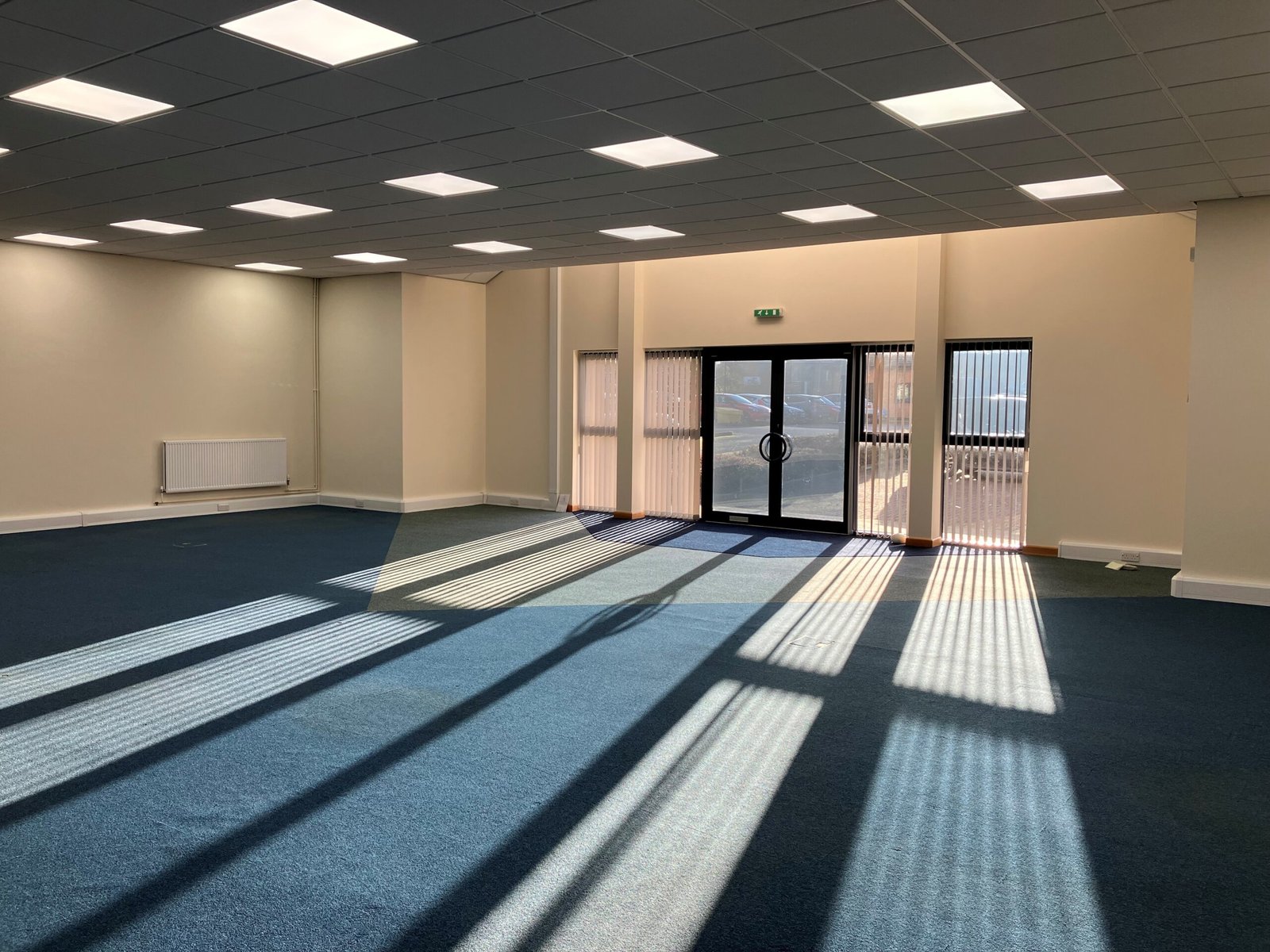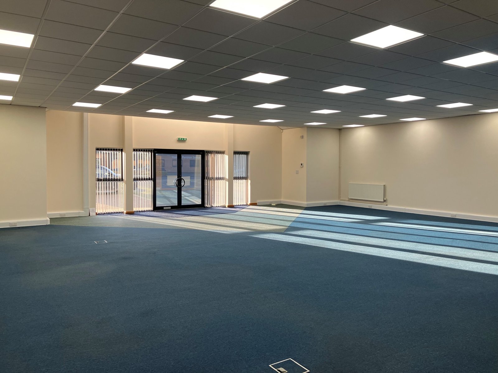 - Open plan office area with glazed reception entrance.