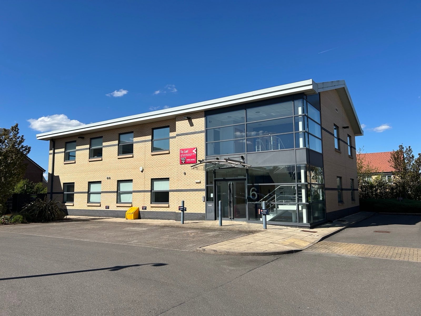 The property comprises a detached two storey modern office building of frame construction with brick elevations under a pitched roof with cladding coverage.