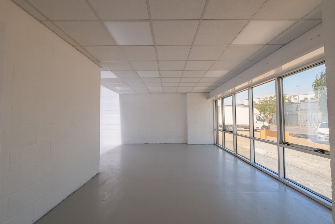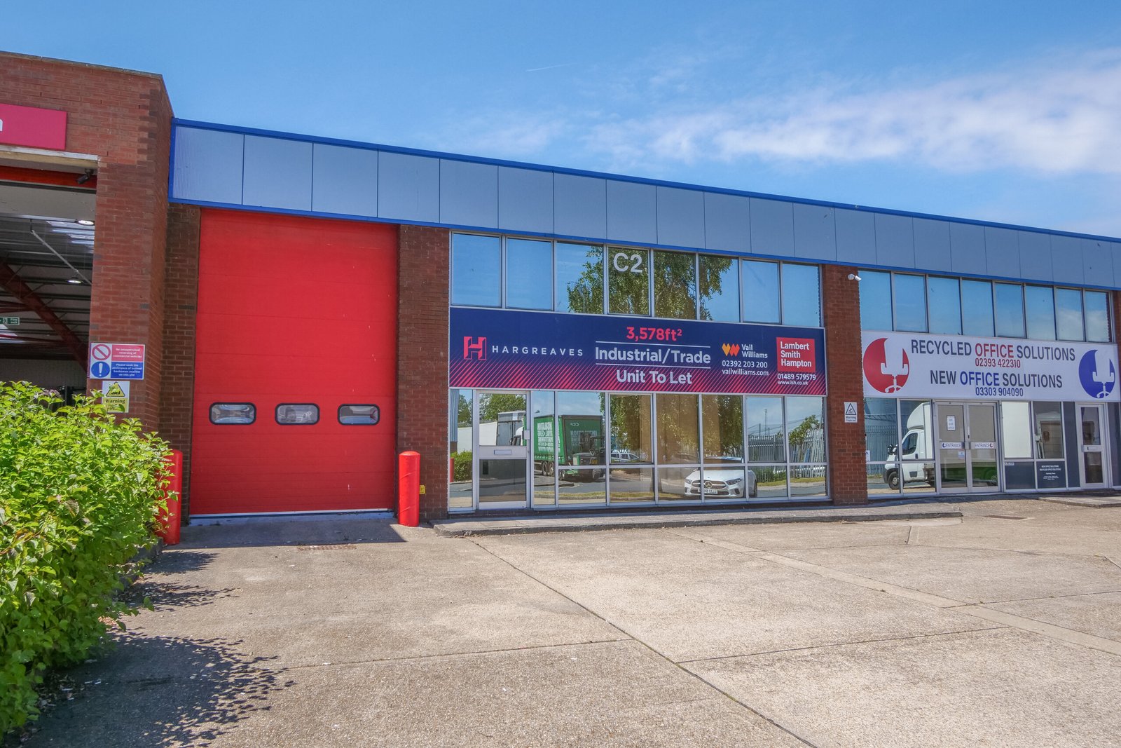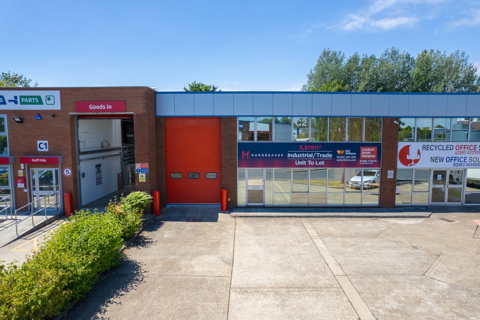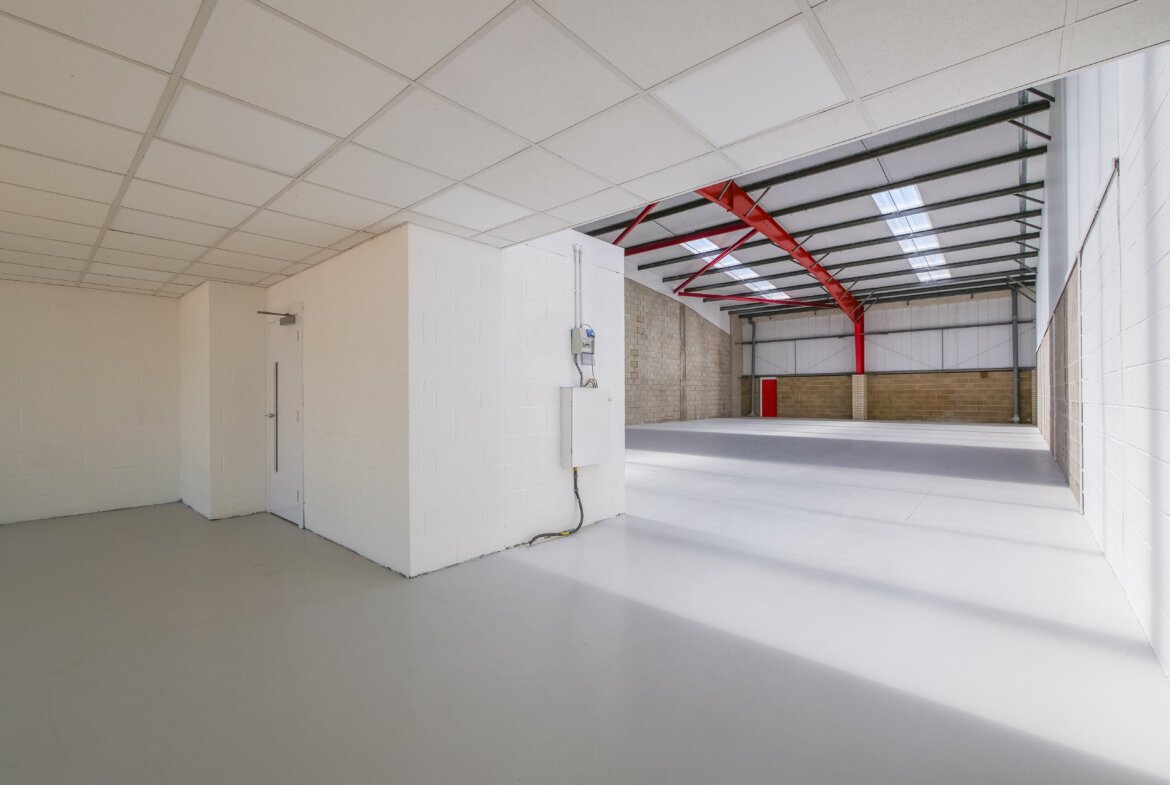 Unit C2 is a mid-terrace unit is of steel portal frame construction with pitched roof incorporating roof lights throughout the warehouse. The warehouse area has clear internal minimum eaves height of 5.3m. There are WCs and offices with mezzanine storage above. The unit has ample parking spaces and loading forecourt. *Subject to terms, the landlord could provide a first floor mezzanine office area of approximately 400 sq ft.*