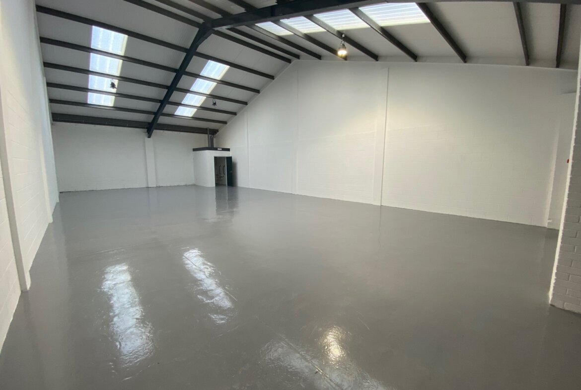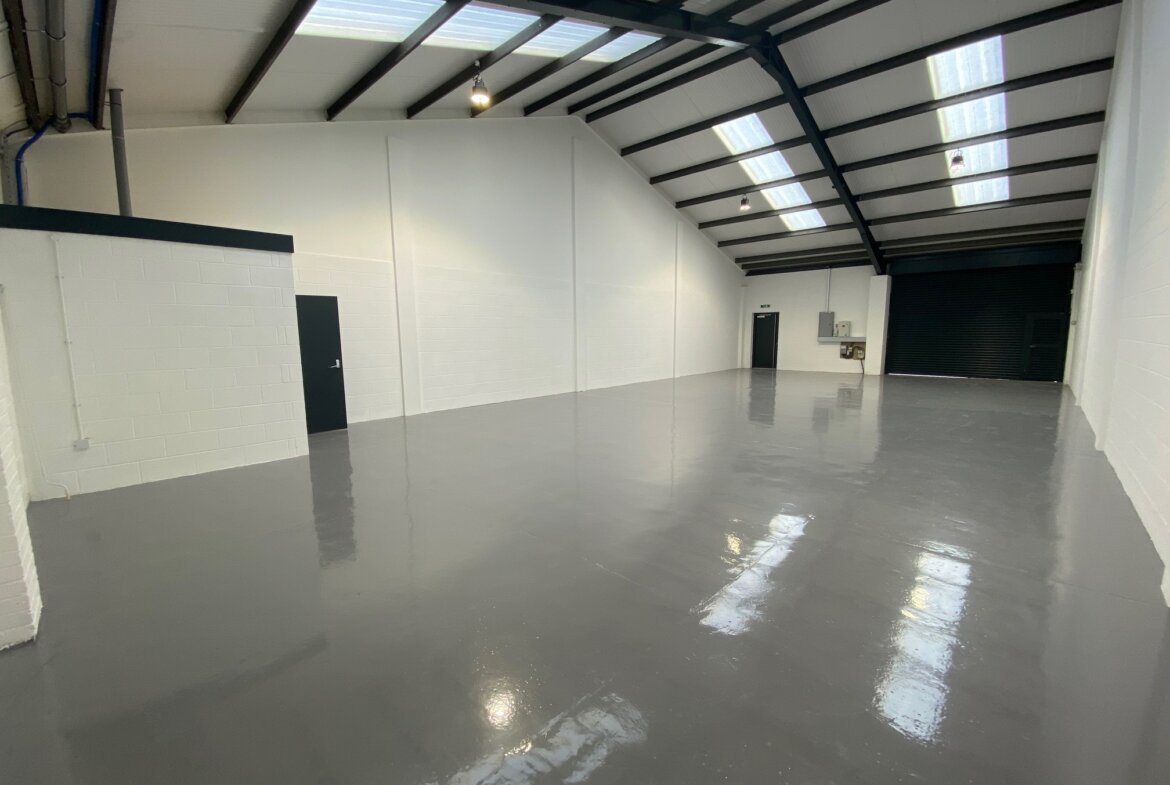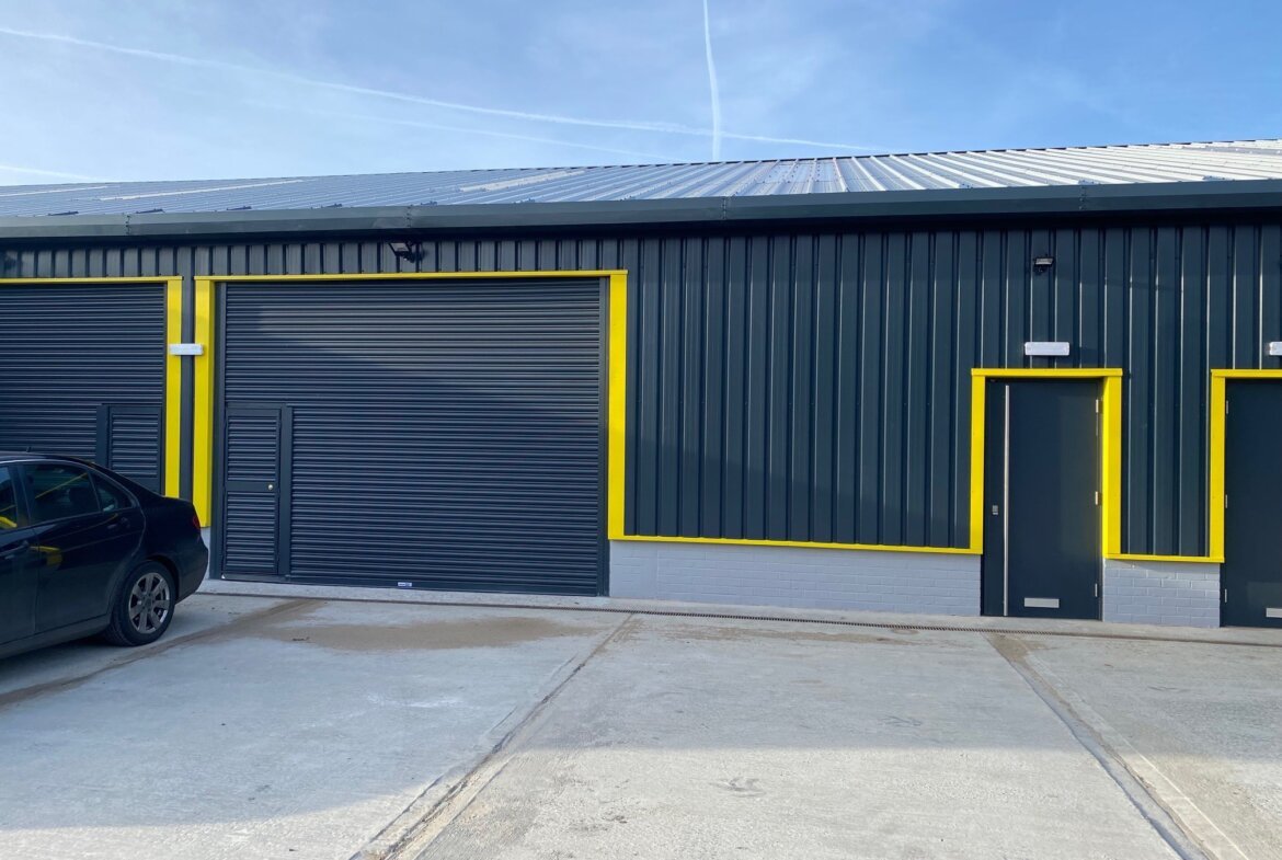 The unit is of steel portal frame construction with profile steel cladding under a pitched and insulated roof incorporating translucent roof lights and features LED high bay lights, loading door, and a single accessible WC.