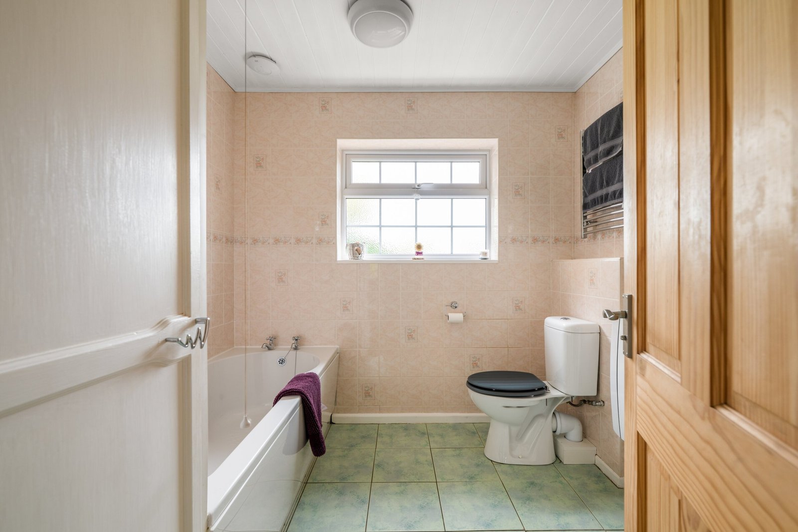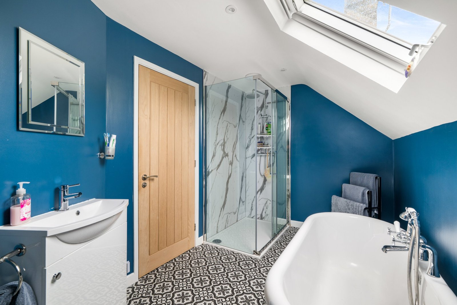 Velux window, double walk in shower enclosure, free standing roll top bath tub, WC unit, vanity wash basin, extractor, tiled flooring, underfloor heating.