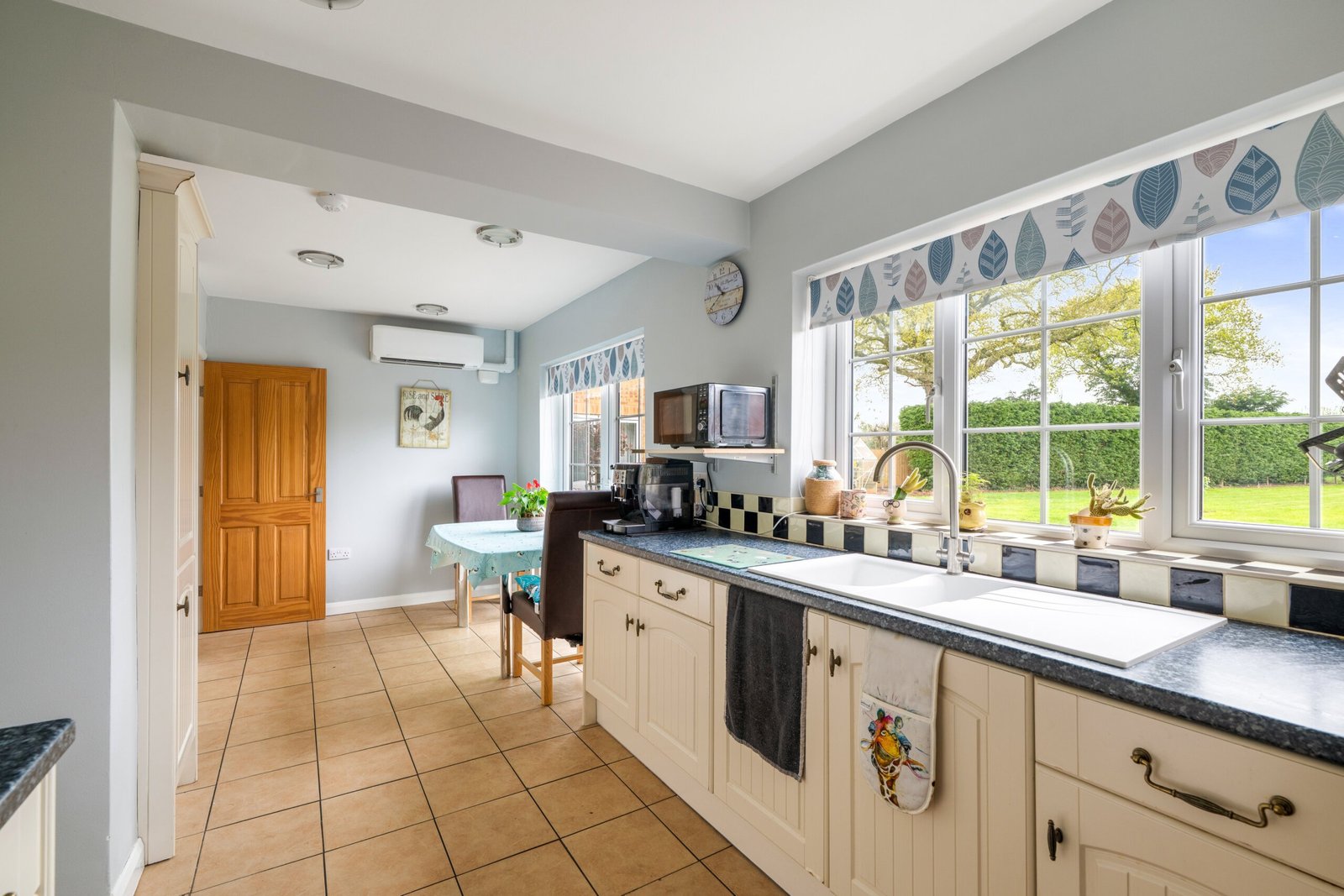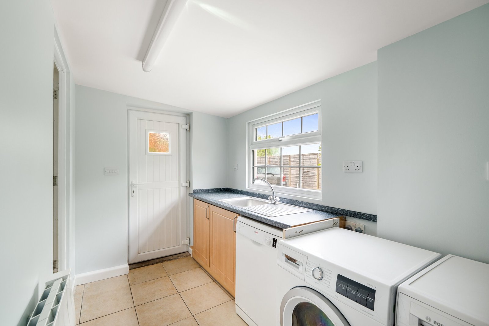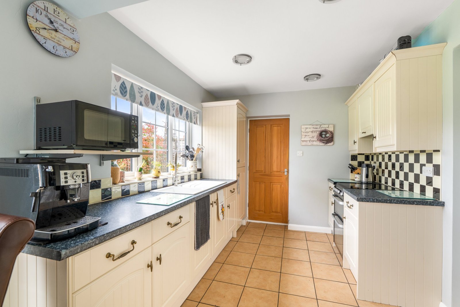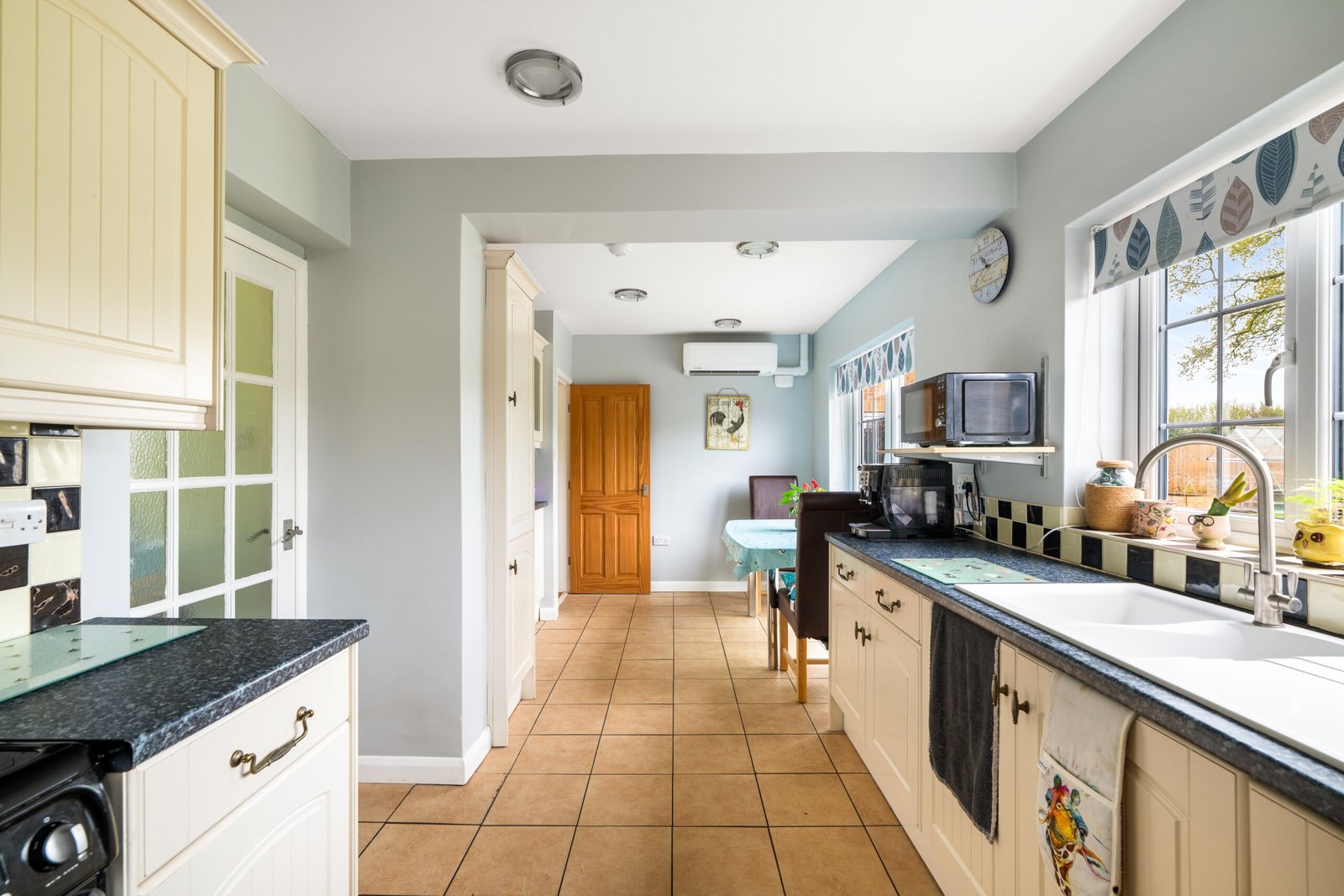 Rear entrance door, double glazed window to side, stainless steel drainer sink, worktops, base level storage units, spaces for dishwasher, washing machine and tumble dryer, tiled flooring, radiator.
