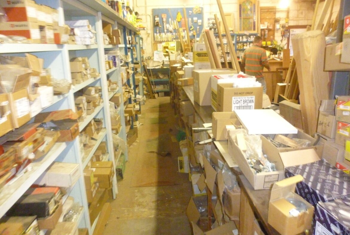 Former shop of 13.91m x 5.81m (45'7 x 19'0) with a range of shelving, fluorescent lighting and wooden counter.